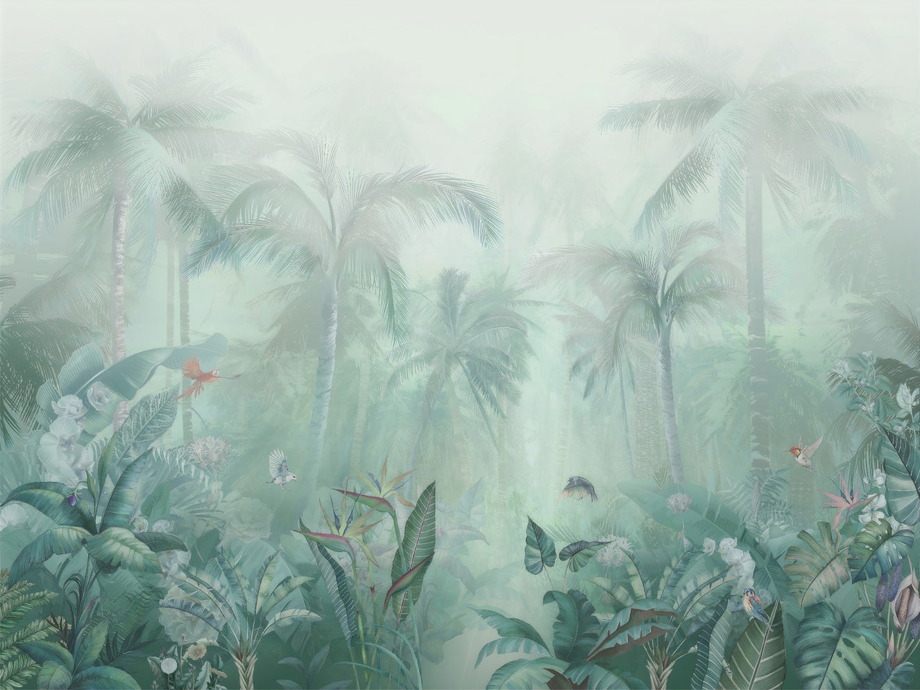 This green forest wallpaper is the best way to describe exotic lush. The hand-painted texture and watercolor print curate a tropical haven indoors, filled with mist and haze. The natural colors elevate the statement, adding visual depth and bringing nature’s bliss to the surface. This rainy forest wallpaper evokes the feeling of gazing through a rain-kissed window into a lush jungle, catching a glimpse of an untouched paradise.