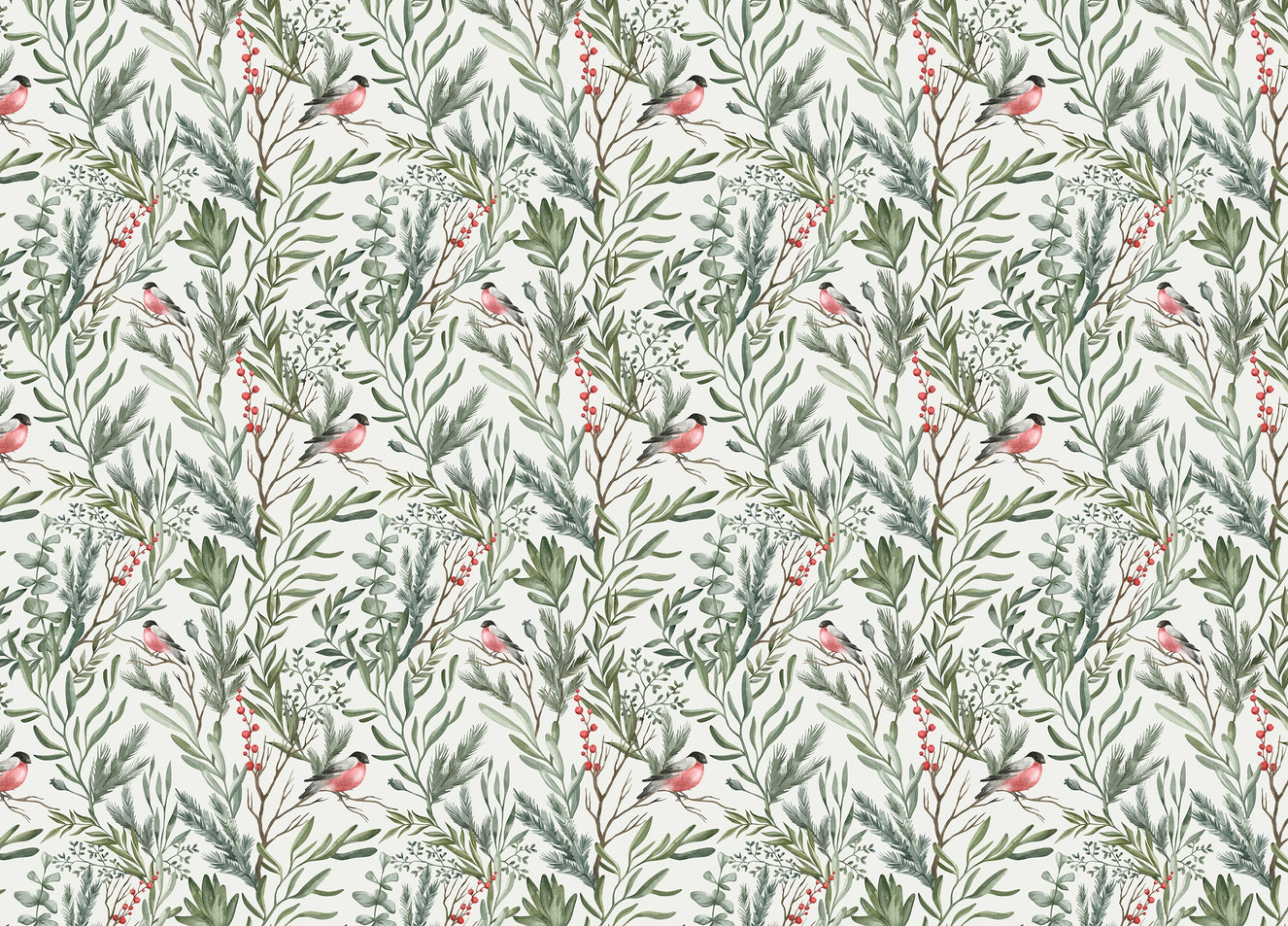 Botanical Watercolor Leaves Bullfinch Bird Foliage