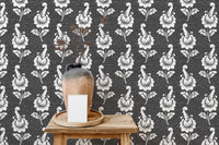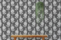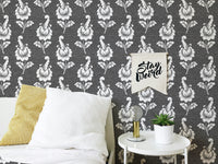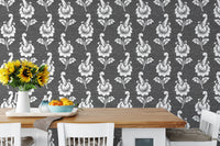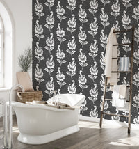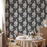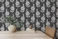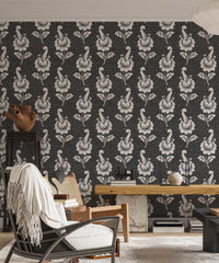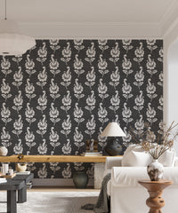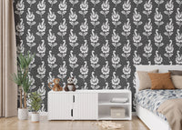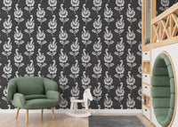 This abstract autumn leaf design brings a contemporary twist to classic damask wallpaper. The bold black backdrop serves as a dramatic canvas for the stylized leaf motifs that capture the essence of autumn's elegance. Ideal for those who appreciate the fusion of traditional and abstract wallpaper styles, it's a design that makes a chic, artistic statement. As the leaves intertwine in an intricate dance, this wallpaper adds a touch of sophistication to any room, becoming the focal point that reflects a love for unique, timeless patterns with a modern edge.