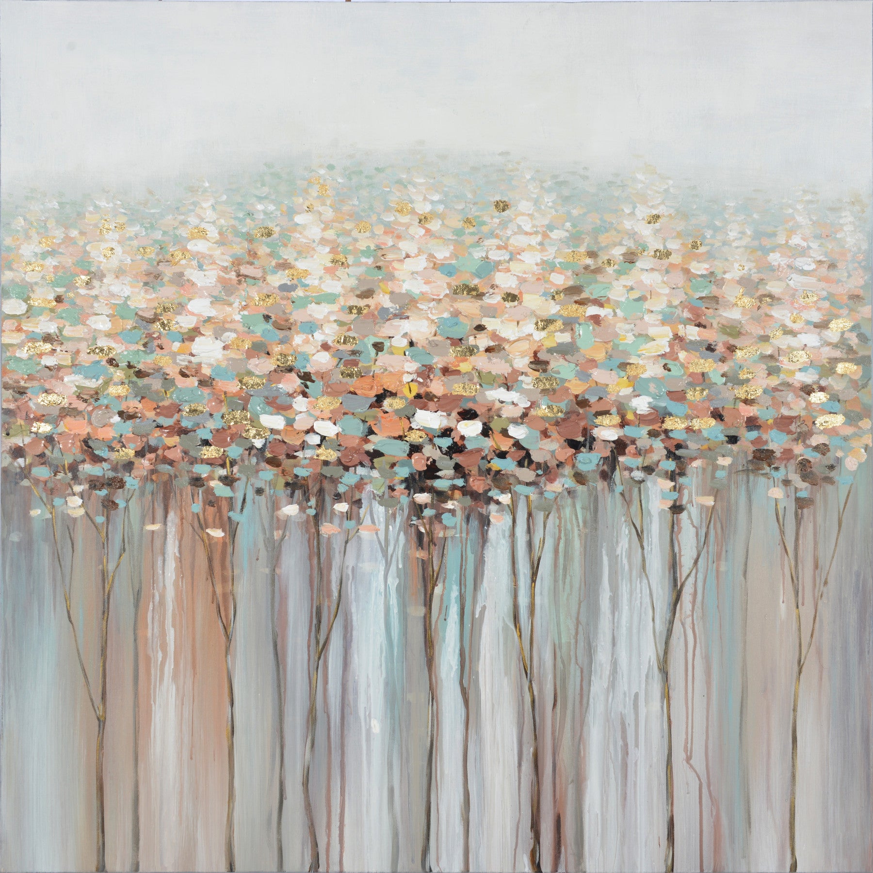 Immerse yourself in the ethereal beauty of Abstract Forest a captivating wallpaper that reimagines the serenity of nature through an abstract lens. This artwork features a dense canopy of delicately painted leaves in soft, muted tones of peach, teal, brown, and cream, punctuated by glints of golden accents that mimic the sun's dappled rays filtering through the foliage. Slender, stylized tree trunks ascend from the bottom, adding a sense of depth and grounding to the dreamy landscape. The overall effect is a calming and sophisticated visual experience, perfect for creating a peaceful atmosphere in any space. Let this artistic interpretation of the forest bring a touch of tranquil elegance and refined charm to your digital environment, providing a subtle yet impactful aesthetic upgrade.