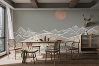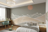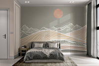 Abstract mountain landscape wallpaper features flowing lines and soft earth tones, creating a modern desert landscape mural with a minimalist aesthetic. The muted color nature wallpaper blends warm beige, soft greens, and subtle browns, making it ideal for Scandinavian and bohemian-inspired interiors. The layered mountain effect adds depth, while the watercolor-style sun enhances the natural feel. This neutral-tone landscape mural works well in living rooms, bedrooms, or offices. The artistic mountain scenery wallpaper offers a calming, contemporary look with organic shapes and elegant curves. This minimalist landscape mural complements various interior styles with its timeless appeal.