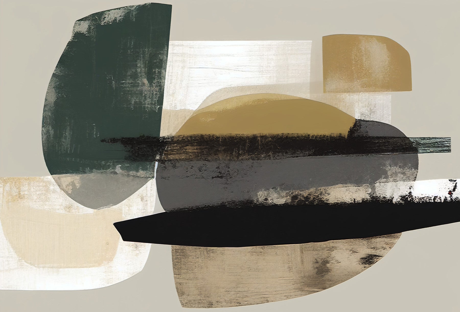 Immerse yourself in the sophisticated allure of this abstract painting, a harmonious blend of organic shapes and contrasting tones. Bold black strokes slice through fields of shimmering gold and muted greens, creating a captivating interplay of light and shadow. The composition evokes a sense of modern elegance, with each element meticulously placed to achieve balance and visual interest. Textural nuances and subtle gradients add depth to the piece, inviting closer inspection and contemplation. Transform your digital space with this refined abstract wallpaper, perfect for adding a touch of artistic flair and contemporary style to your devices. Let the drama of black and the warmth of gold elevate your screen with understated luxury.
