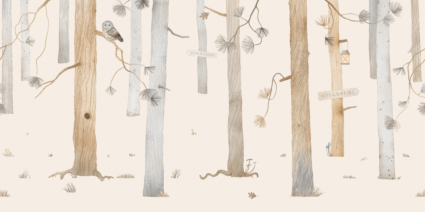 Spark imagination with this inviting forest wallpaper. Soothing shades of beige and grey illustrate a tranquil woodland, complete with direction signs to 'Mountains' and 'Adventure', along with a wise owl perched on a branch. Soft tones evoke a sense of serenity and exploration. Use this wallpaper for walls to create a peaceful atmosphere within a nursery, kid's room, or reading nook. The gentle design adds a touch of nature’s wonder, effortlessly enhancing a range of interior spaces.