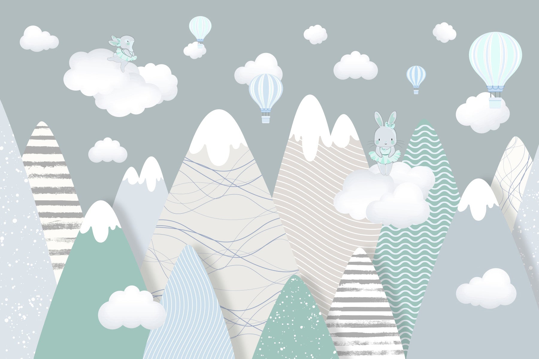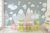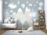 Embark on a whimsical journey with Alpine Ascension Blue, a charming wallpaper that captures the serene beauty of a pastel alpine landscape. Gentle shades of blue and green paint the majestic mountain range, offering a calming and inviting atmosphere. Delightful hot air balloons float gracefully amidst fluffy white clouds, adding a touch of playful adventure. Two adorable bunny figures add a touch of childish glee, creating a soothing and magical ambiance. The soft, muted color palette creates a tranquil escape, perfect for nurseries, children's rooms, or anyone seeking a peaceful retreat. Let this delightful scene transport you to a world of imagination and serenity, where dreams take flight among the peaks and clouds. This playful design blends stylized patterns with dreamy imagery, offering a unique and eye-catching feature wall.