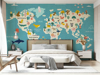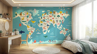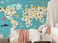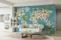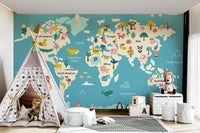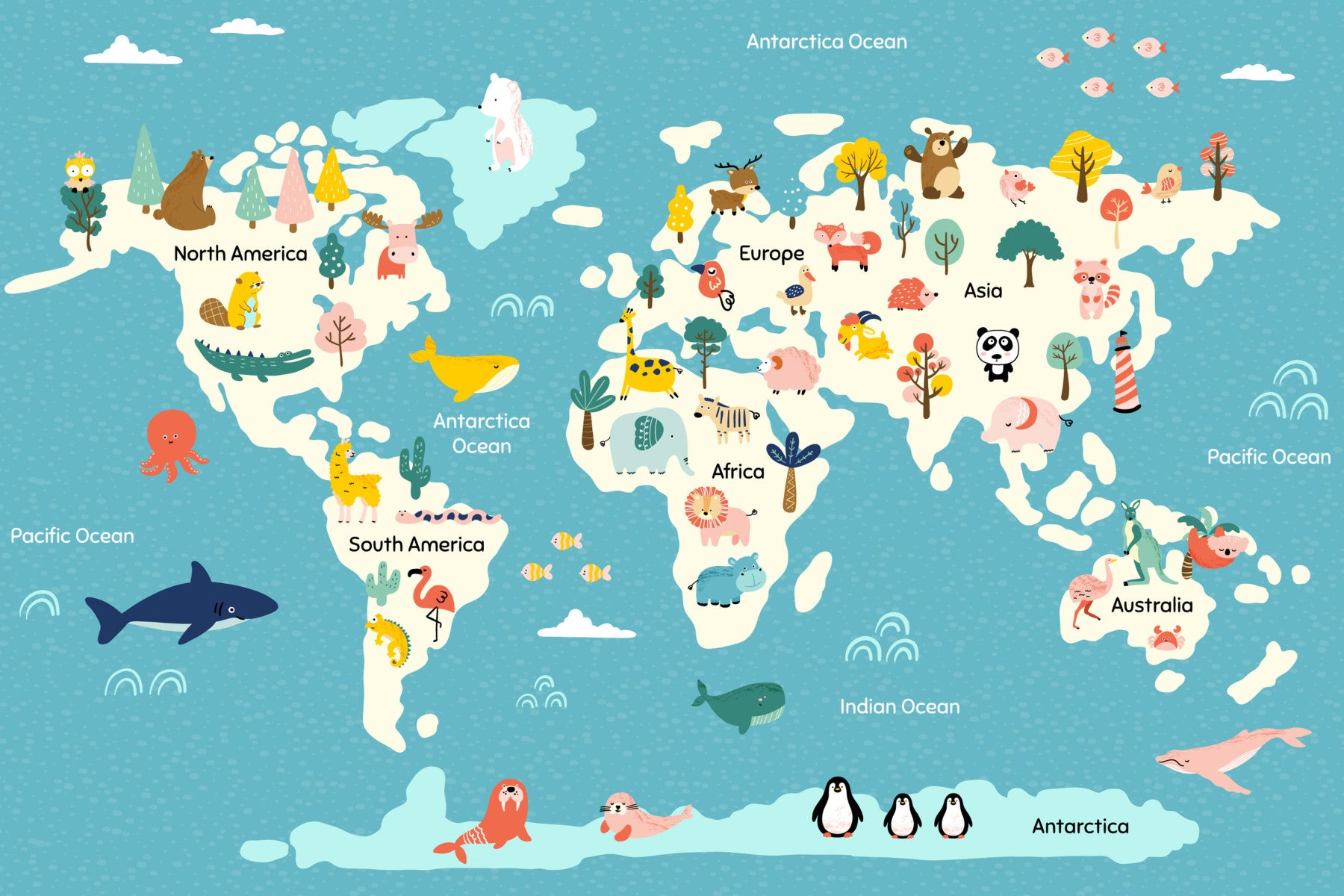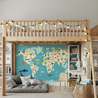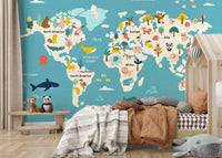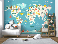 Embark on a delightful journey around the world with this charming animal-themed map. Each continent comes alive with playful illustrations of animals, flora, and trees. It sets against a soft blue backdrop and enhances any child's room. This wallpaper for walls is the perfect addition to a nursery, playroom, or kid's bedroom, fostering a sense of exploration and wonder. Let your child’s imagination soar as they discover the animal kingdom from the comfort of their own space.