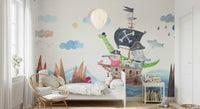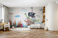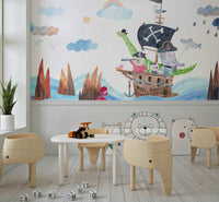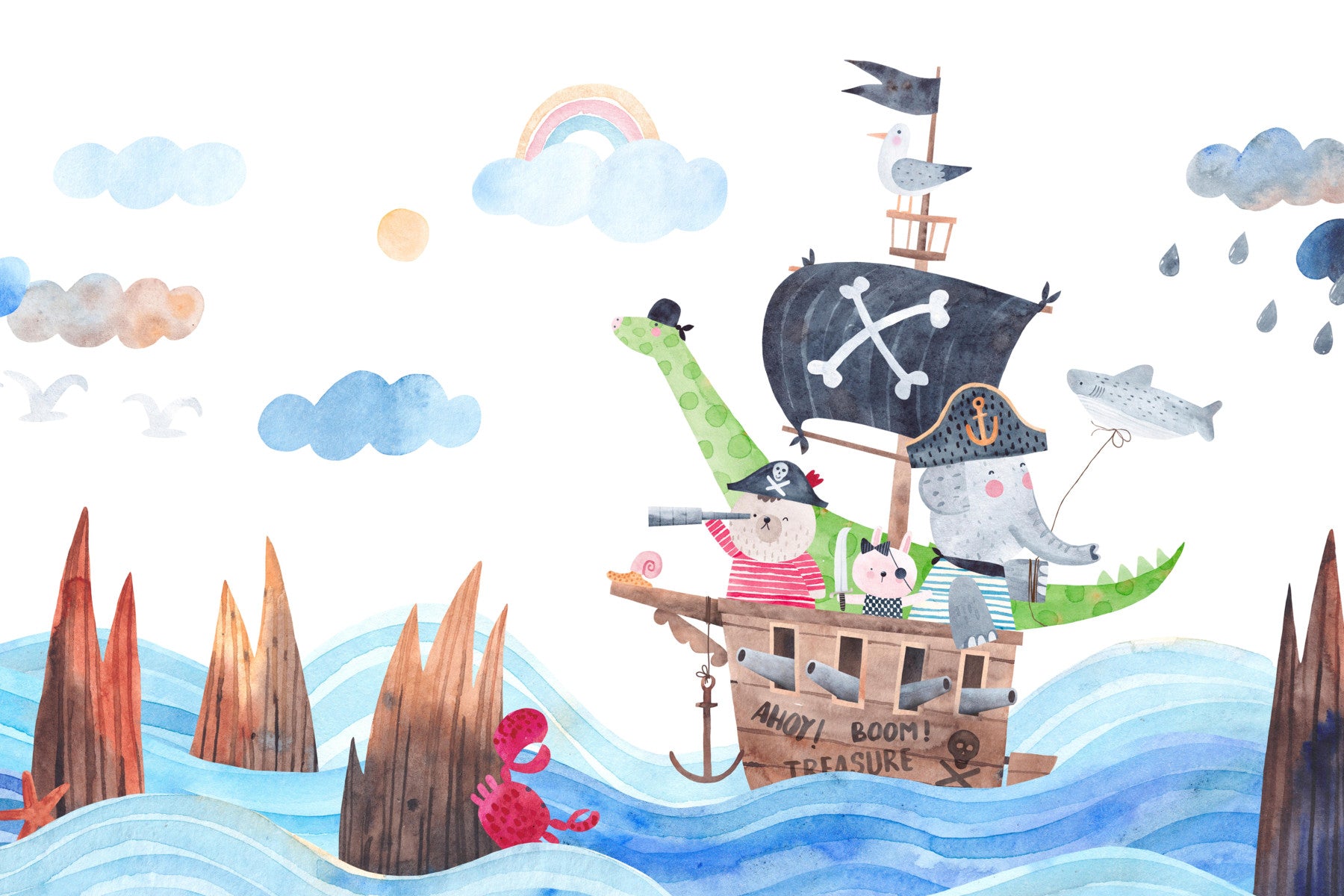 Set sail with this whimsical animal pirate adventure! Watch a bear, bunny, elephant, and dinosaur embark on a treasure hunt across watercolor waves. Gentle blues blend with earthy browns, creating a serene yet playful ambiance. The artistic details make this wallpaper for walls a delight in children's rooms or nurseries. This design sparks imagination and complements fun, bright interiors.