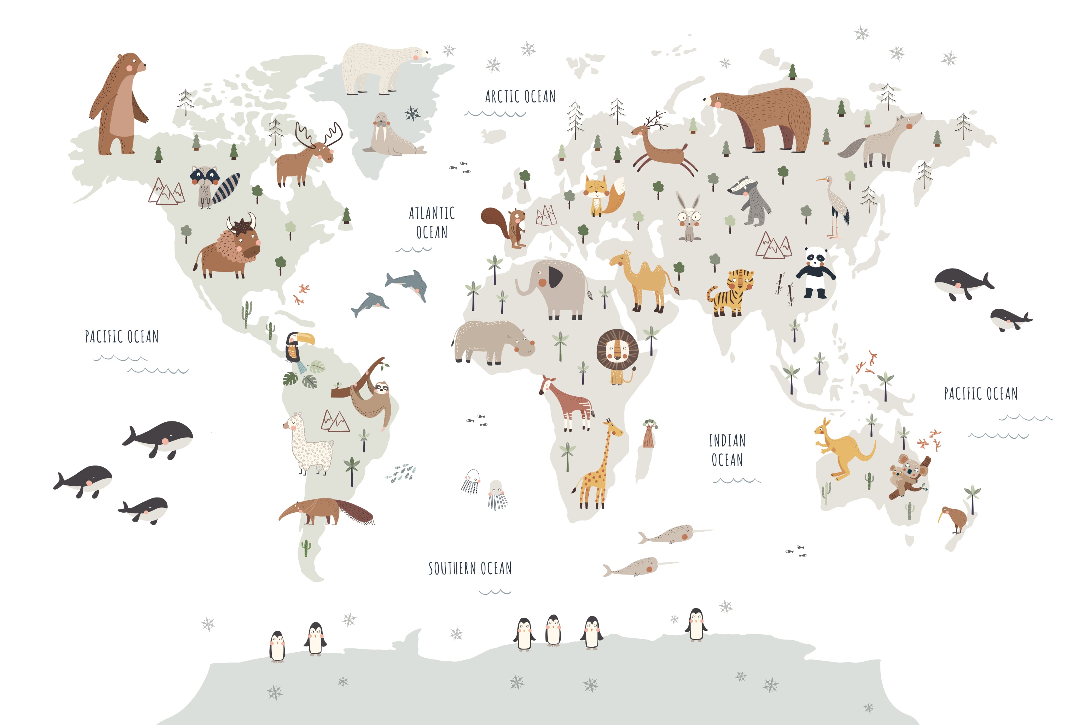 Animal-themed world map mural in soft white hues