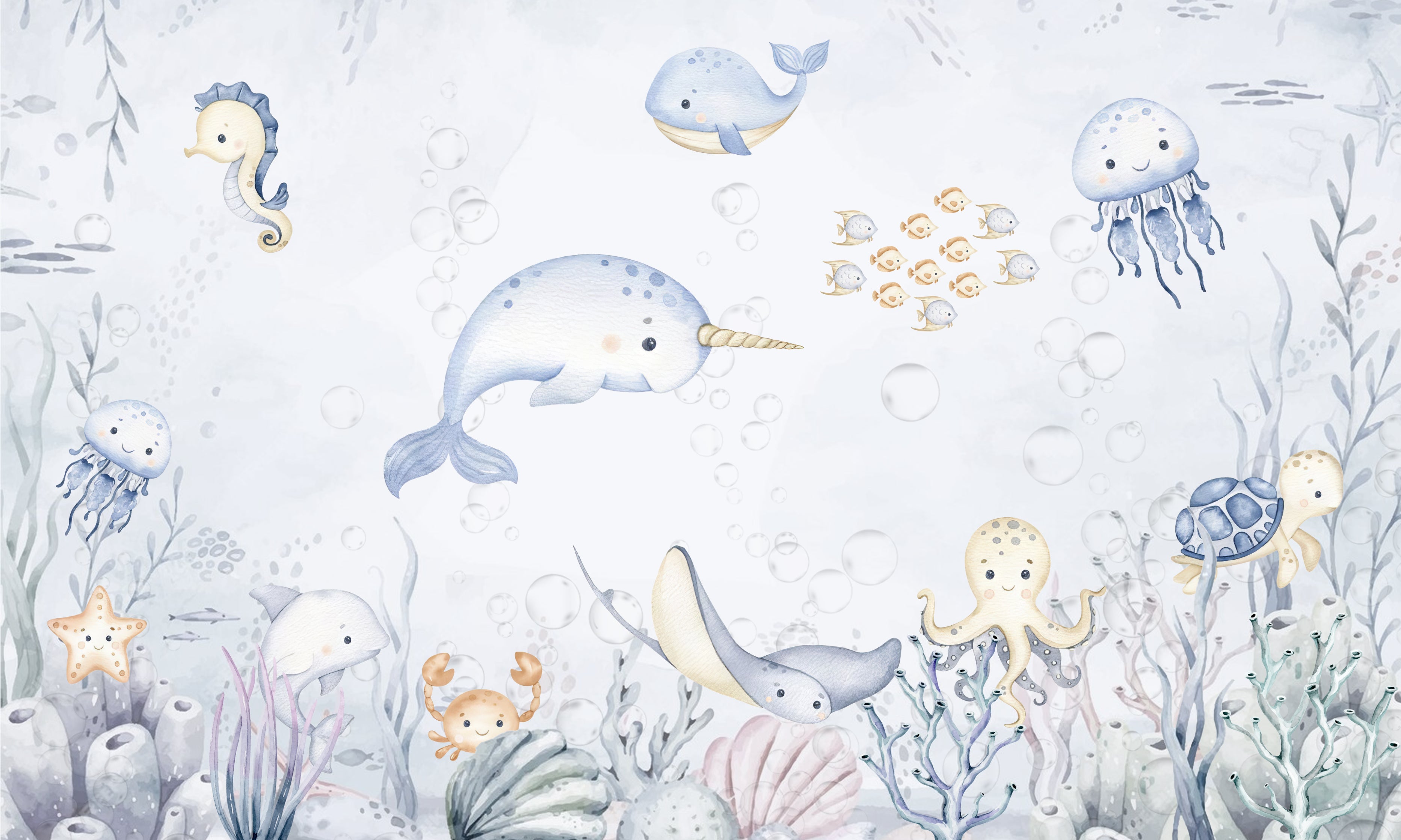 Aquatic animals kids room wallpaper mural provides a unique marine life experience ideal for kids' rooms. This wallpaper brings the underwater world to life and provides a calming space in your room. It is a colorful painting showing the seahorse, crab, jellyfish, octopus, and many more. So, if you love the oceanic view, then this wallpaper will be ideal for children’s bedrooms, playrooms, or study areas.