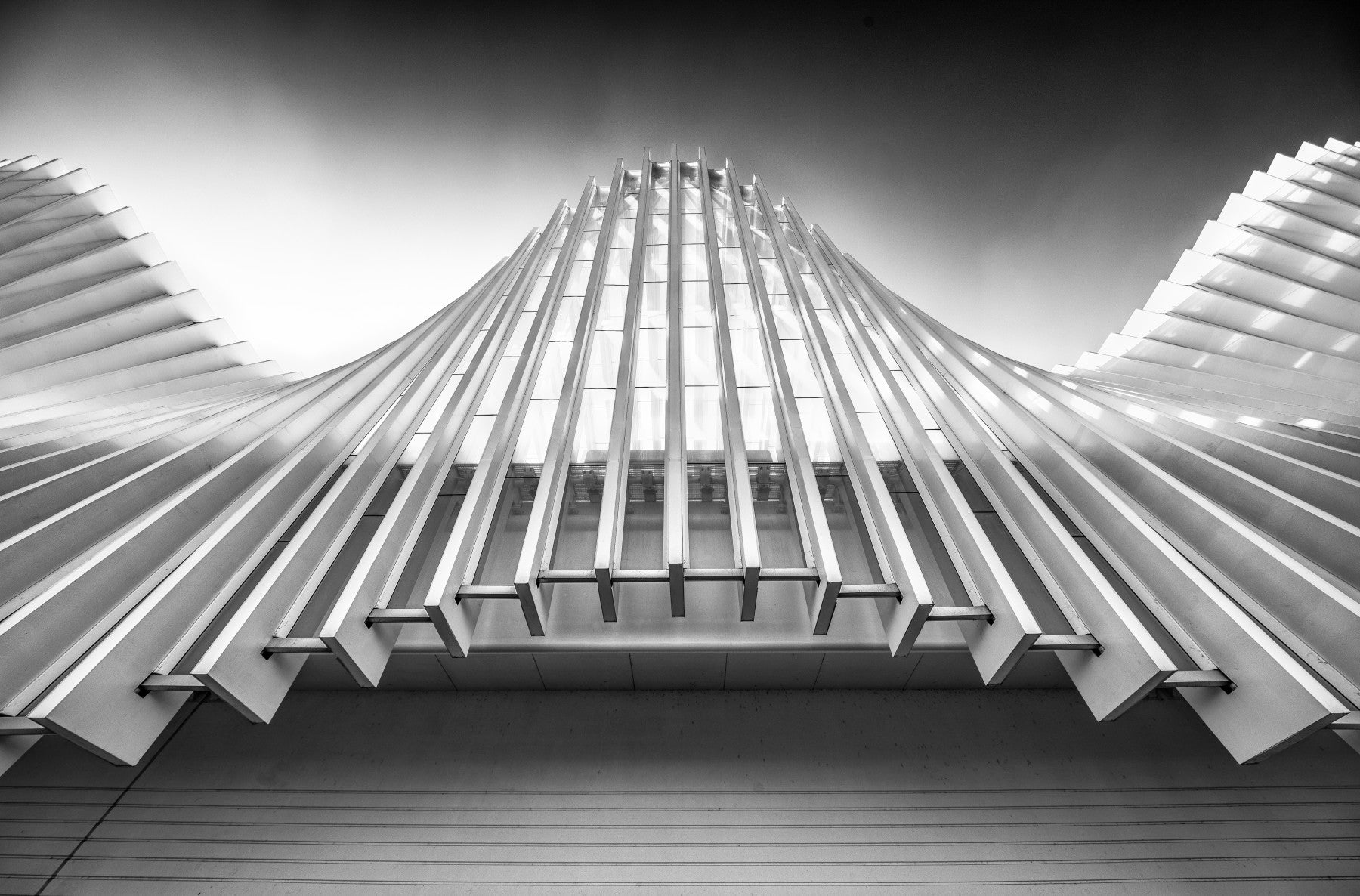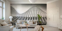 This striking black and white wallpaper features a mesmerizing architectural design. The upward-reaching lines create a dramatic and modern feel. The monochromatic palette adds a touch of sophistication and works well in any space. Use this wallpaper for walls to bring a unique, contemporary touch to your living room, office, or entryway. The geometric pattern complements both minimalist and industrial interiors.