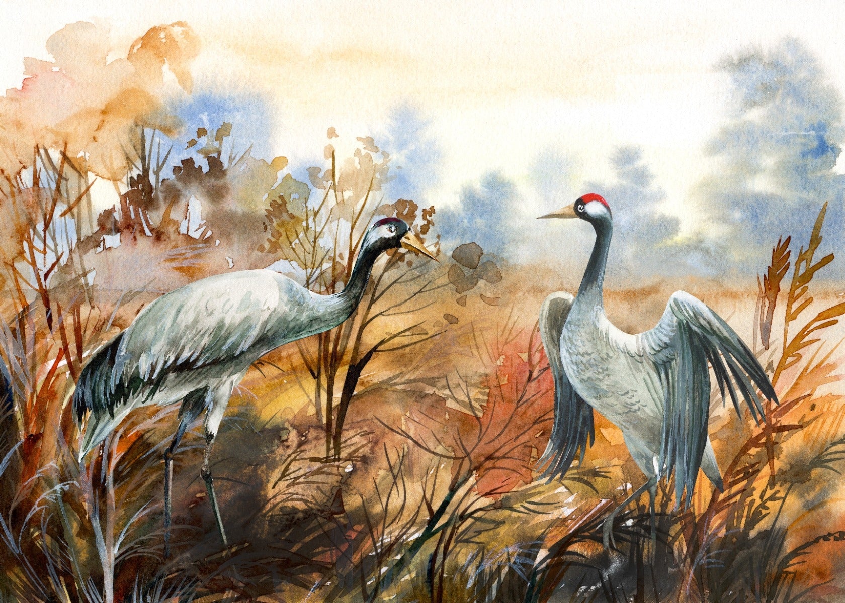 This wallpaper suits living rooms and bedrooms and will get you in the mood for autumn. Autumn landscape & crane birds watercolor wallpaper murals with bird cranes are a lovely way to incorporate nature into your home decor. It is suitable for any room due to its delicate design and soft, stylish, and soothing colours.