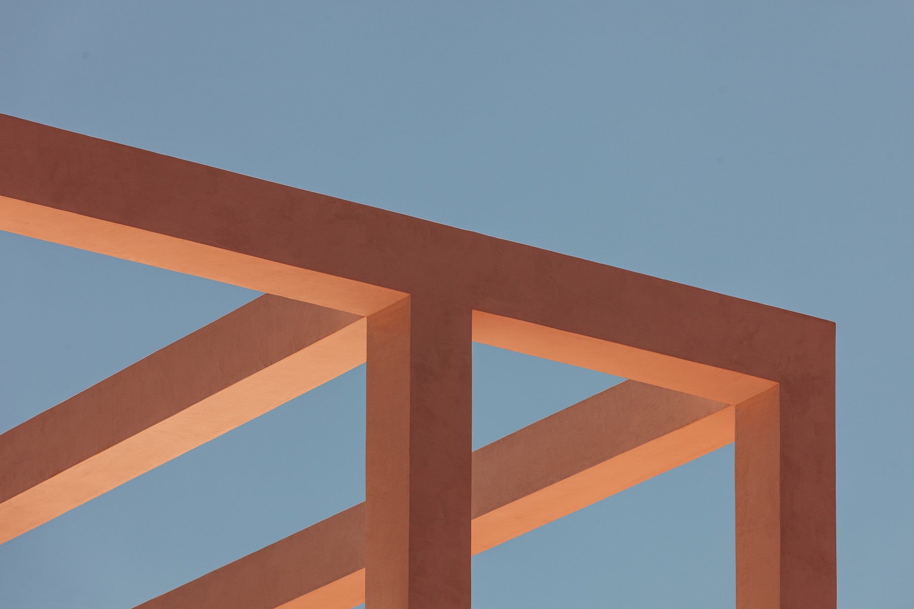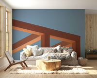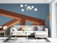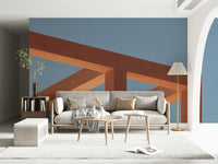 Transform your space with this captivating abstract wallpaper. A robust framework of coral-toned beams intersects against a serene azure sky, creating a striking visual contrast. Its clean geometry injects a modern edge, perfect for living rooms, studies, or entryways. This wallpaper for walls enhances interiors, offering a sophisticated statement piece that promotes a sense of calm and structure. Embrace the architectural elegance it brings to your space.