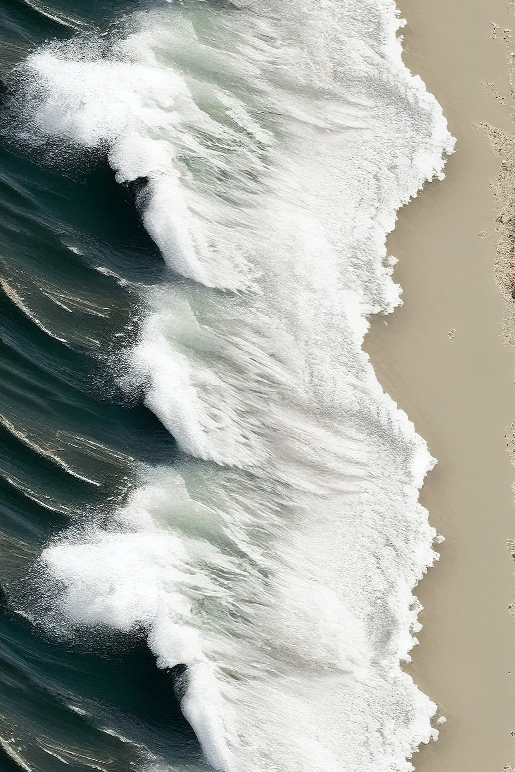 Immerse yourself in the untamed beauty of 'Beach Wave,' a captivating aerial view of the ocean's raw power. This wallpaper showcases the dramatic collision of deep turquoise waters and frothy white crests as waves surge toward the shore. The rhythmic patterns of the waves, frozen in time, create a mesmerizing display of nature's artistry. The contrasting textures of the smooth, dark sea and the chaotic, foamy surf evoke a sense of both tranquility and exhilaration. A narrow strip of sandy beach provides a grounding element, reminding us of the constant interaction between the ocean and land. 'Beach Wave' is perfect for those seeking a dynamic yet calming backdrop, bringing the energy and serenity of the sea to your digital space. Transform your screen into a window to the ocean with this stunning natural masterpiece.