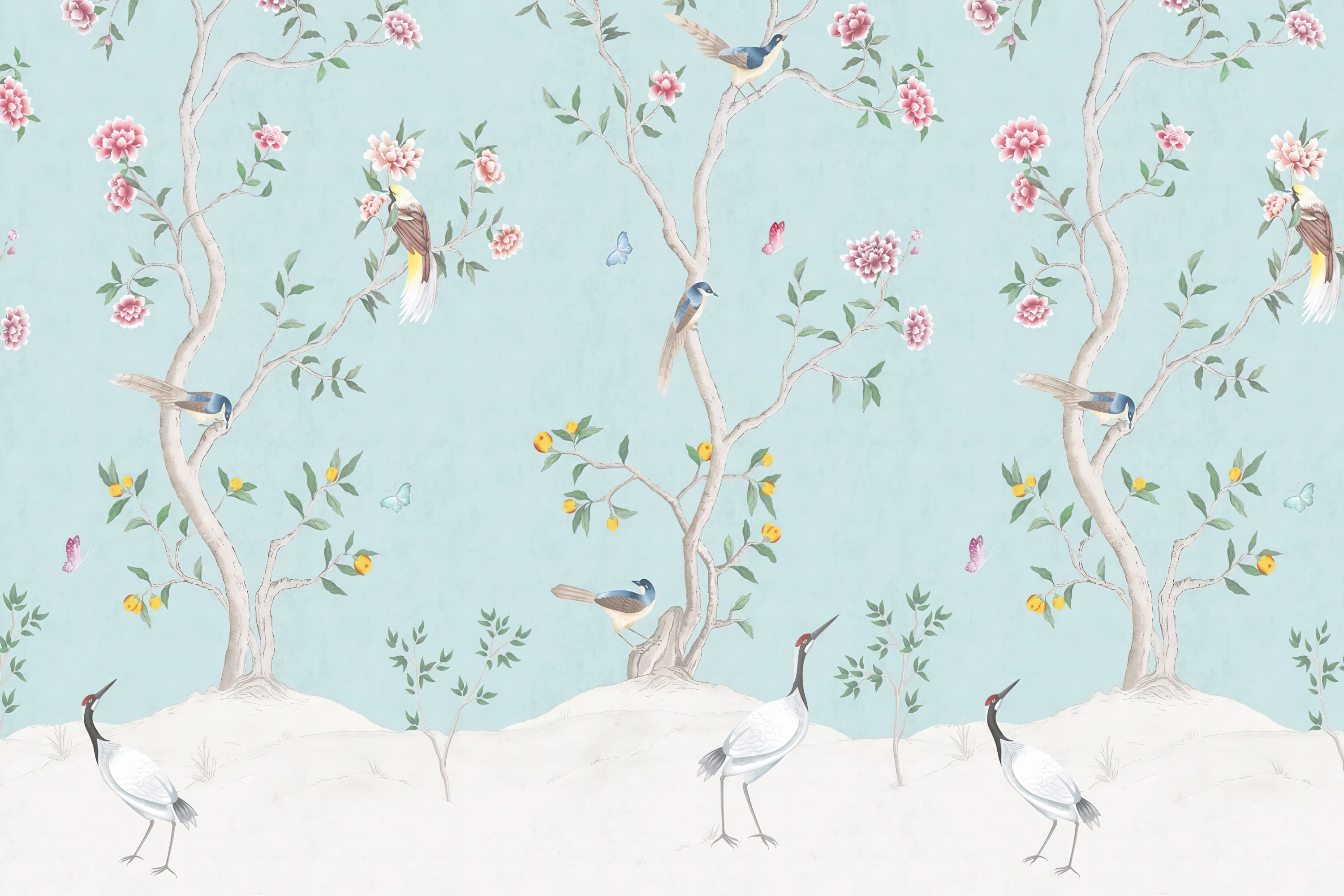 Add some luxury to the house. This complex mural is full of birds, hung on the flowers and the branches, and was created in the spirit of style and perfection. Chinoiserie style has always been valued for its elegance and sophistication, and it has never lost its vogue for modern and classic interior design. Its soft colors blend well with the light of a room without dominating the room. This wallpaper is available now with Free Delivery for your convenience and is suitable for bedrooms, dining, or living.