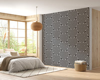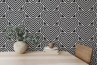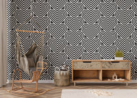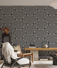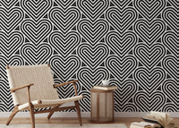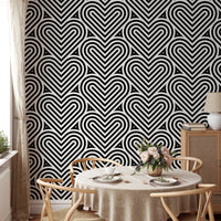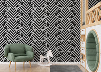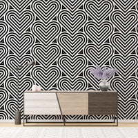 Add a contemporary flair to your interiors with our black and white geometric pattern linear hearts wallpaper. This chic geometric wallpaper is a symphony of precision, showcasing an intricate array of linear hearts that interlock in perfect harmony. Its monochromatic palette ensures versatility, complementing a wide range of decor themes. Ideal for creating a striking feature wall or a subtle backdrop for your living area or office, this design merges aesthetic appeal with a playful touch. Bring a fresh, modern vibe to your rooms with this eye-catching pattern.