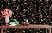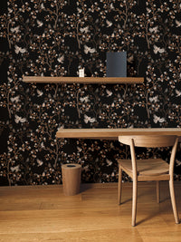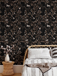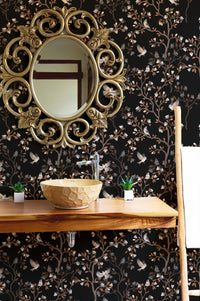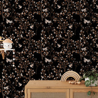 Step into a world where the allure of chinoiserie wallpaper meets the intimacy of your bedroom sanctuary. This black wallpaper, featuring an elegant repeat pattern of magnolia trees and birds, weaves a visual poetry that whispers tales from afar. As bedroom wallpaper, it serves as a canvas for dreams, where the intricate dance of flora and fauna invites a sense of wonder and timeless style. Envision restful nights enveloped in the artistry of distant lands, where each glance reveals another layer of its storied charm, making every awakening a rendezvous with beauty.