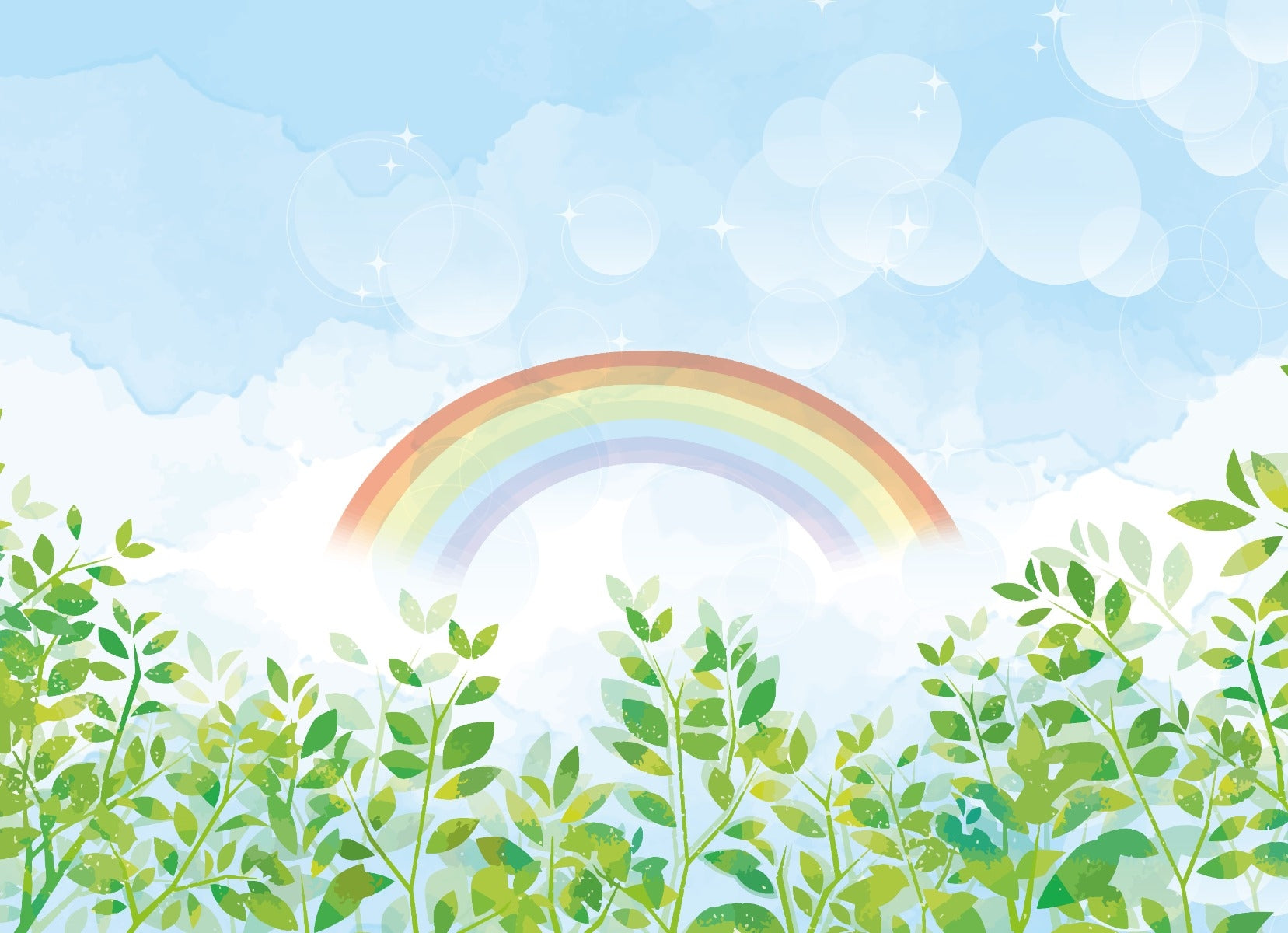 Blue and Green Watercolor Rainbow Kids Wall Mural set against a chromatic rainbow, complete with clouds, bubbles, and leaflets in the background, makes a statement. Rainbow adds a splash of color to your space, clouds with sparkling bubbles add a playful touch, and these leaflets finish off the dewy mood.