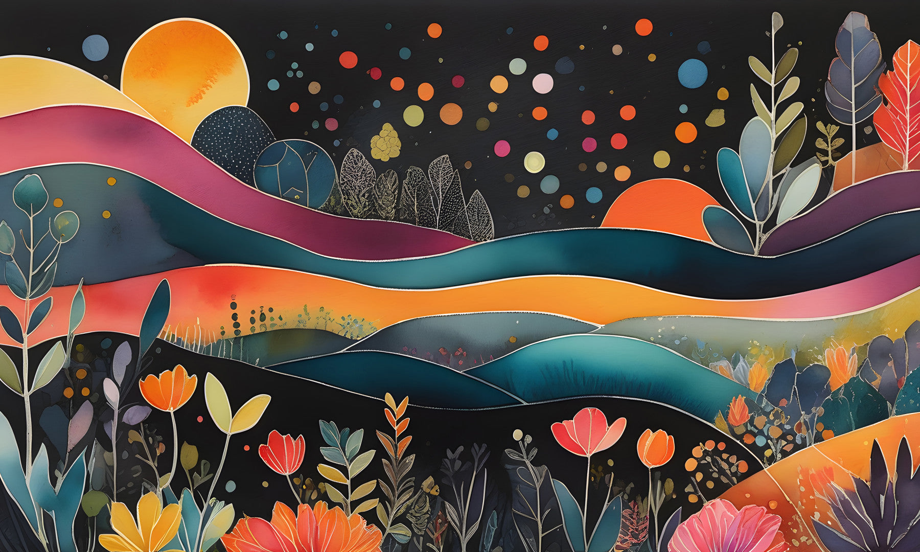 Introduce a dreamy vibe with this enchanting wallpaper for walls. It features stylized floral landscape, a dark backdrop scattered with colorful dots, and soft, curvy lines. The color palette mixes bold orange with soothing teal and lavender, creating visual interest. This design suits living rooms, bedrooms, or even a creative office space. Its unique style transforms any wall into a statement piece and complements bohemian or modern interiors. Enjoy the artistic charm and transform your spaces with this wallpaper!