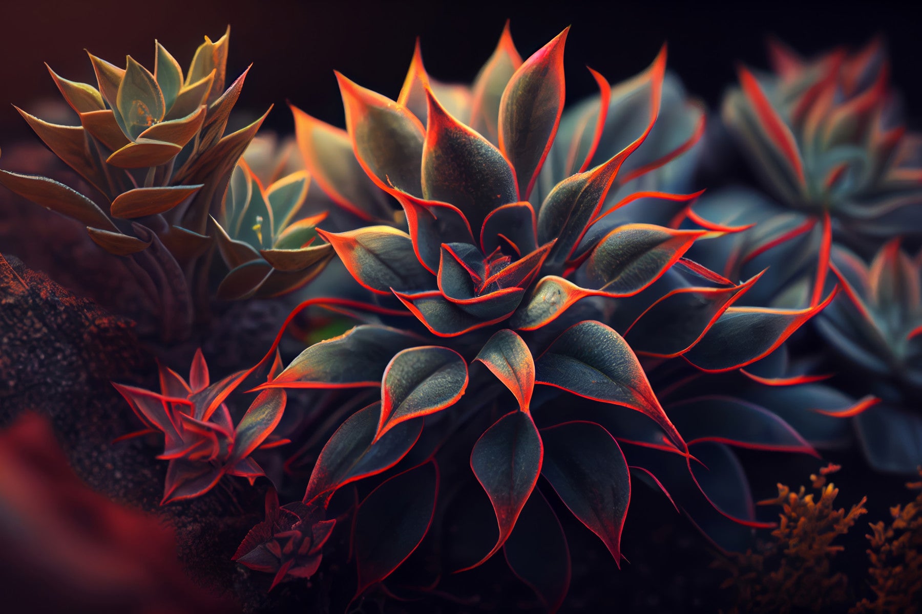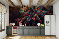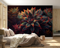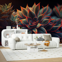 Immerse yourself in the captivating allure of 'Botanic Bouquet,' a wallpaper that unveils nature's dramatic artistry. This design showcases a cluster of succulent plants, each leaf meticulously detailed and outlined with a vibrant, fiery red. The stark contrast of the deep, cool greens against the bold red edges creates a visually striking and unforgettable effect. The play of light and shadow adds depth and dimension, highlighting the intricate textures and patterns within the botanical arrangement.