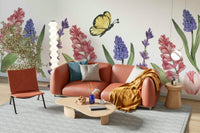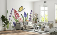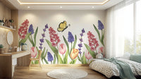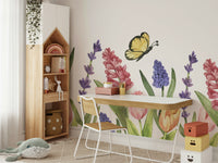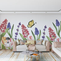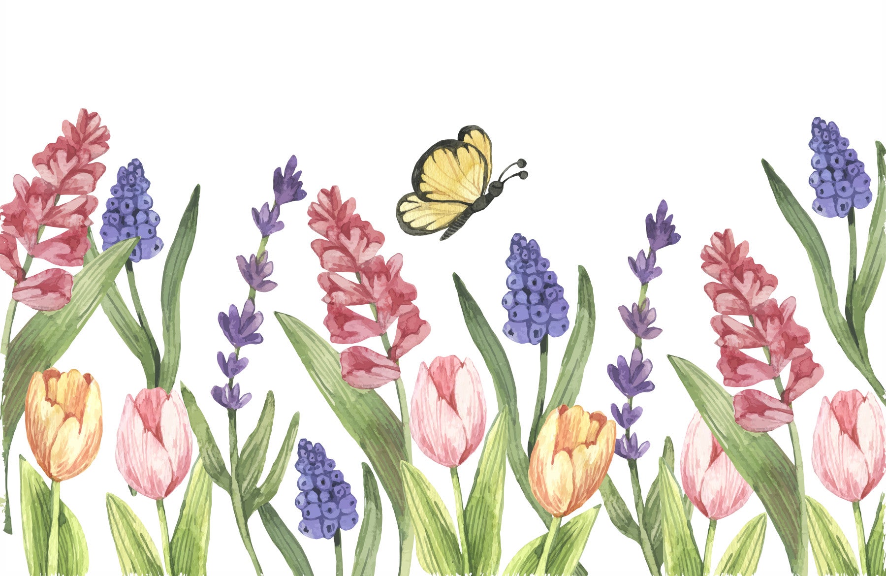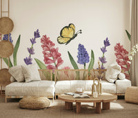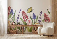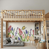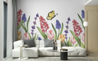 Bring a garden indoors with this blossoming wallpaper. The hand-painted style tulips and hyacinths in shades of yellow, pink, and purple make this a delightful accent for any room. A gentle yellow butterfly gracefully flits through the scene. The design features clean lines and soft hues. The wallpaper for walls adds a touch of nature's serenity to your living space, perfectly complementing bright interiors, a cheerful nursery, or a light-filled bedroom.