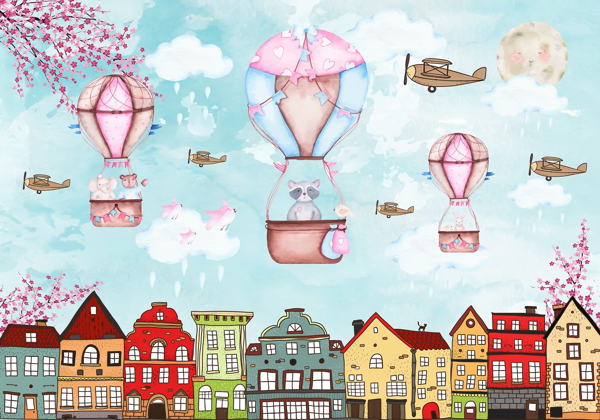 Cartoon city mural featuring a vibrant aerial escapade for walls.