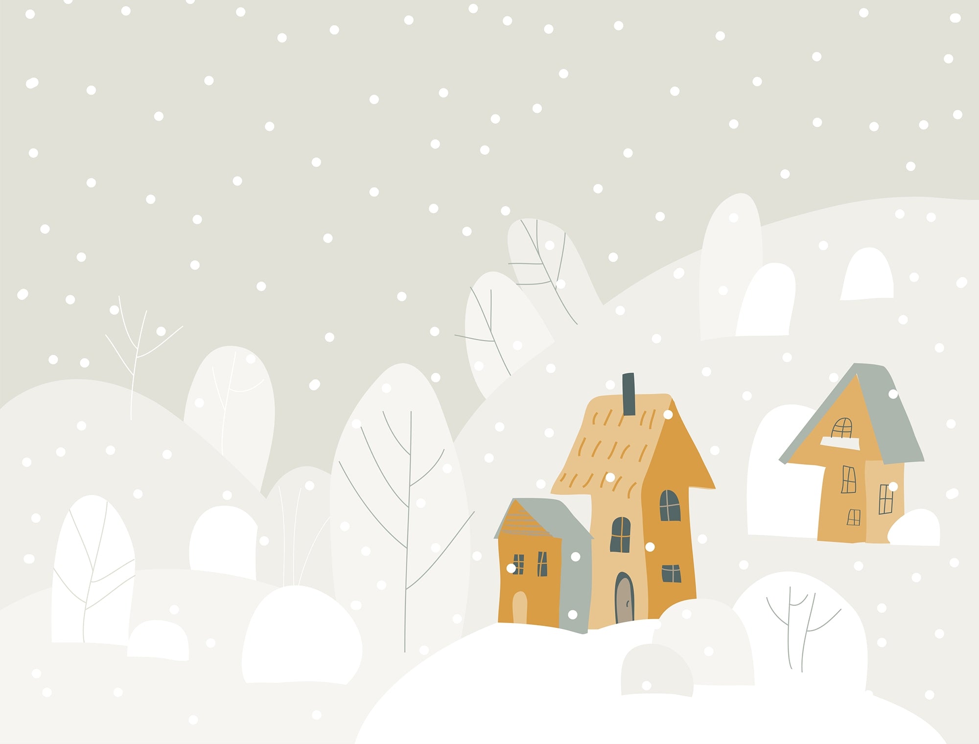 The Cartoon Mountain Escape wallpaper mural is a whimsical winter landscape with cozy houses in rolling snowy hills. Soft neutral tones paired with minimalist details create a harmonious, inviting atmosphere, making it ideal for a bedroom for kids or a playroom or nursery environment. The playful illustration of snowflakes, trees, and charming homes contributes to any room's warm and innovative atmosphere. Easy to assemble and clean, this good-quality mural is designed for durability and everyday use and will be a delightful way to build a serene and storybook atmosphere for children and families alike.