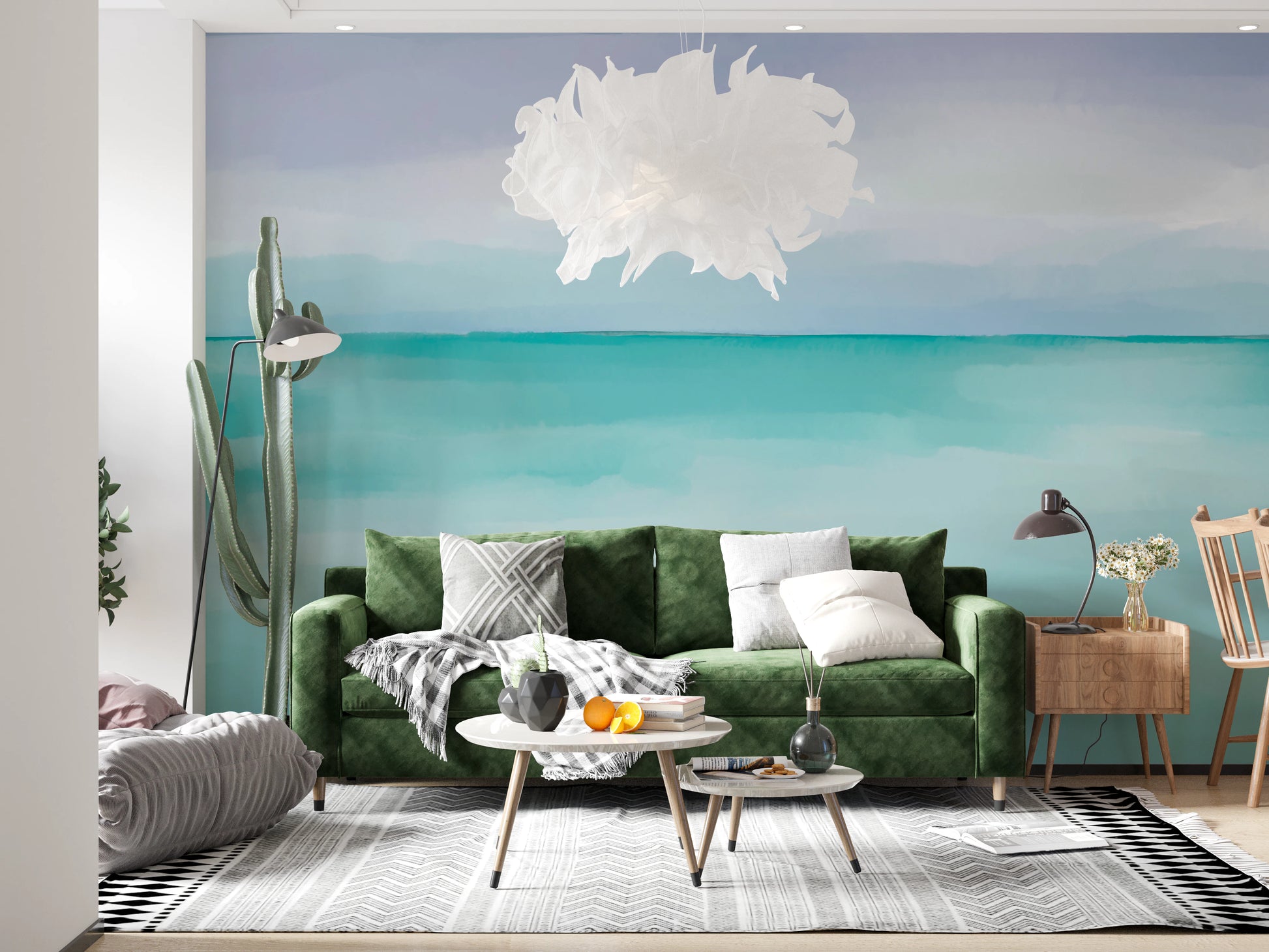 Drift into serenity with this calming watercolor wallpaper for walls. The design captures the essence of a tranquil ocean view with soft hues of turquoise and gentle whites. This serene color palette makes it ideal for bedrooms, bathrooms, or any space where relaxation is key. The simple yet evocative design complements minimalist, coastal, or modern interiors, bringing a breath of fresh air into your home.