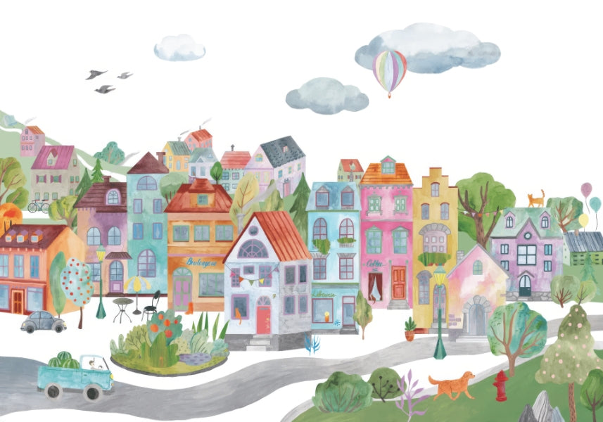 Colorful cityscape wall murals—find a place where one can seamlessly blend whimsy with their colors on wall surfaces. This watercolor mural wallpaper, made of dreamy strokes, reveals a scrubbed clean within the vibrant milieu of an urban tapestry. Imagine morning light spilling through kaleidoscope windows across this cityscape, with each building fun-wise. Perfect for an individual who wants a little bit of whimsy in their home, it combines the quiet flow of watercolors with the lively spirit of city life. Make your room the canvas where you can find a different view every time you look around for color-infused joy.