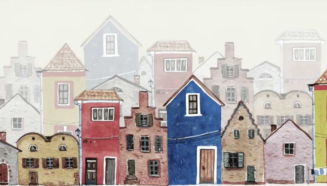 This mural of colorful European houses adds an air of gaiety to any room. An assemblage of lovely houses with brilliant colors and pleasant detail creates a warm and cozy atmosphere for any place. Use nursery wallpaper to create a fun or relaxed space. Ideally suited to nursery paper or anywhere where warmth and charm are sought, this one's easy-to-apply mural is an innovative art vehicle to bring color into the space. Great to get into a children's room or living area, this mural is the summation of bright, cheerful, and welcoming.