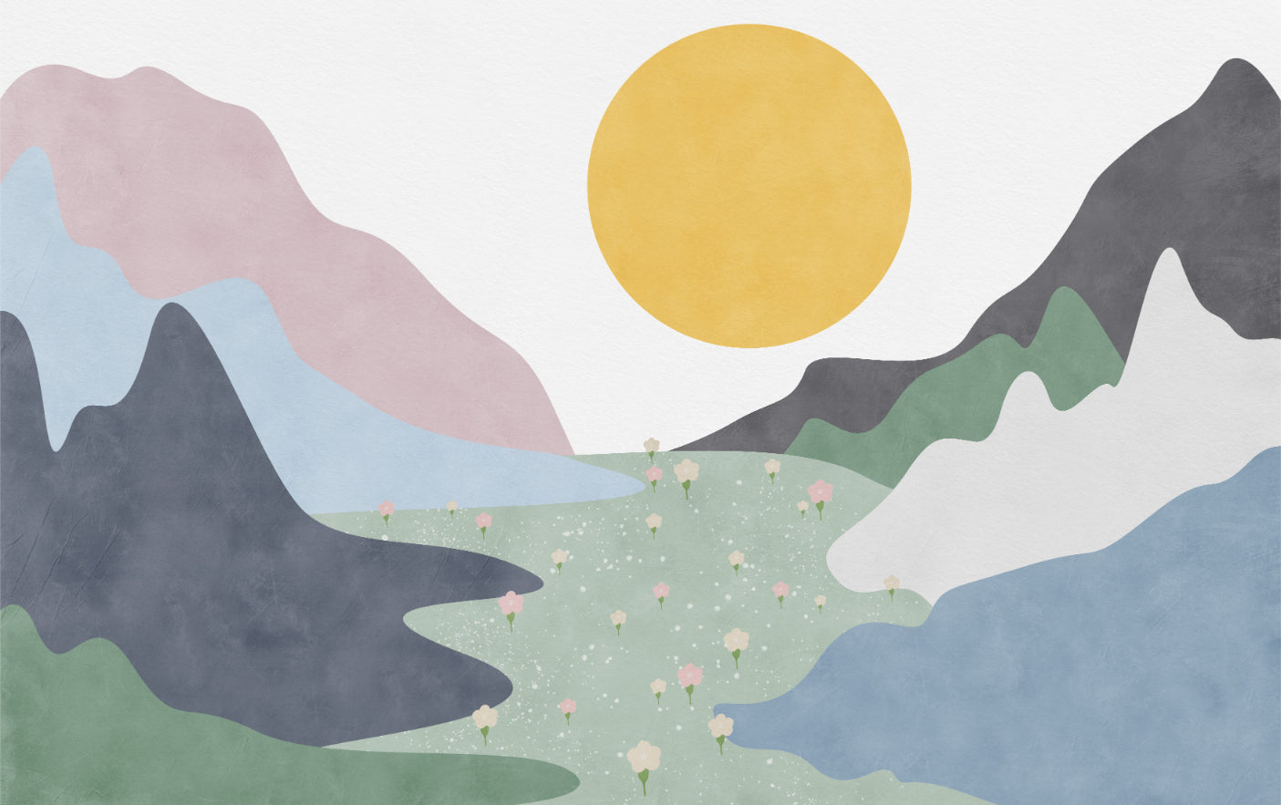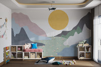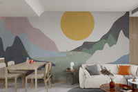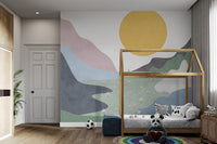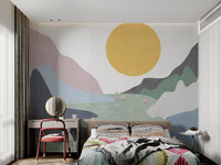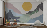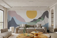 showcases an abstract landscape with pastel mountains, a sunrise, and a field of flowers. This design brings a nature-inspired aesthetic that’s both modern and subtle. Each element, from the layered mountains to the scattered flowers, is thoughtfully placed to create a tranquil scene that enhances your wall's appeal. Ideal for those seeking a minimalist yet lively look, this mural fits seamlessly into diverse settings. Its combination of colors and scenery makes it a unique and inviting addition to your wall. Shop now and enjoy free shipping.