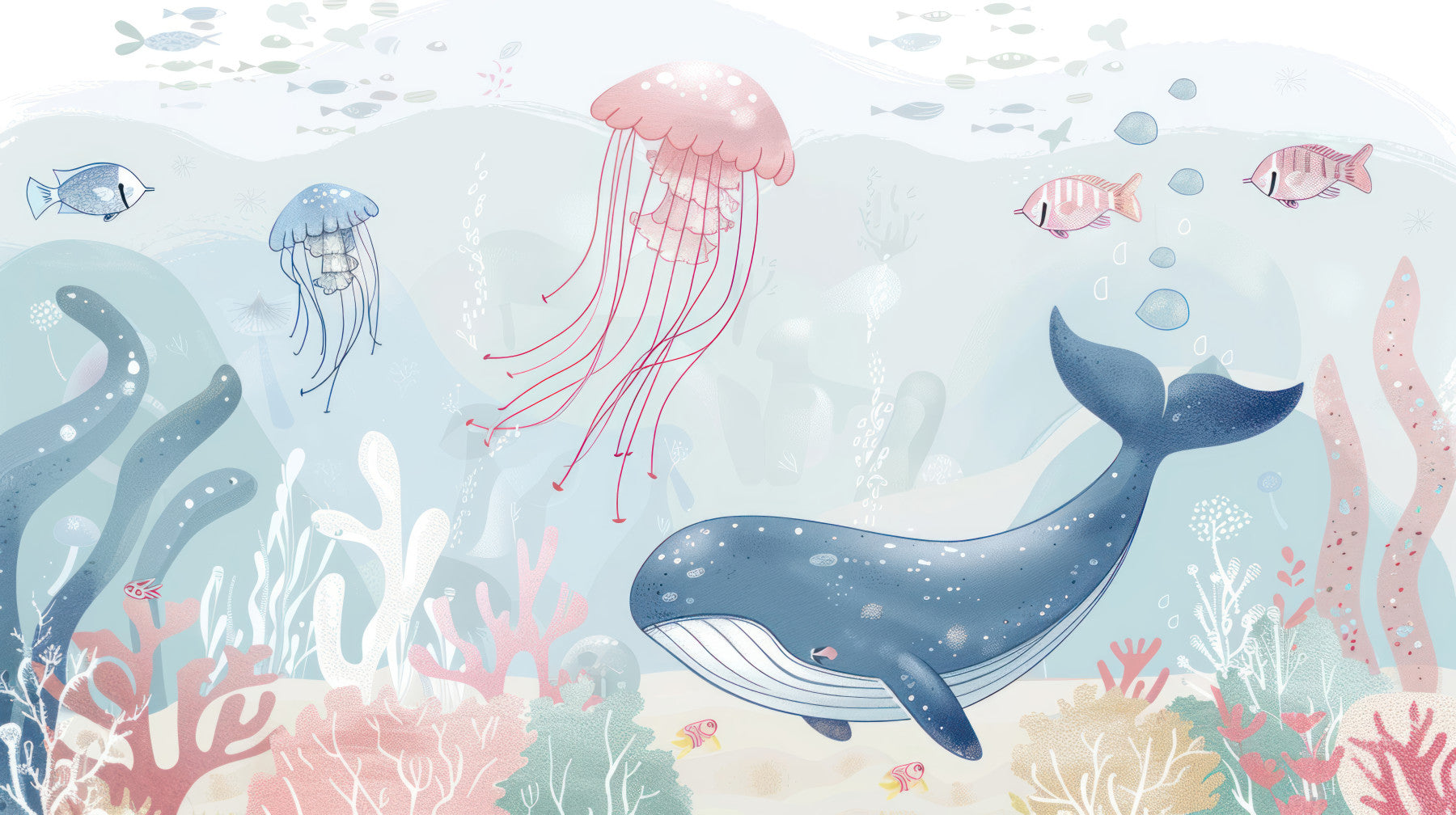 Transform any space with this captivating wallpaper for walls. This design showcases an illustrated scene with a friendly whale gliding amongst delicate jellyfish and small fish swimming in a coral reef. The soft pastel palette of blues, pinks, and corals create a relaxing, tranquil atmosphere. It's perfect for a nursery, child's bedroom, or even a bathroom, bringing a touch of the serene underwater world to your home. The delicate details and soothing colors complement interior design schemes with a playful, imaginative touch.