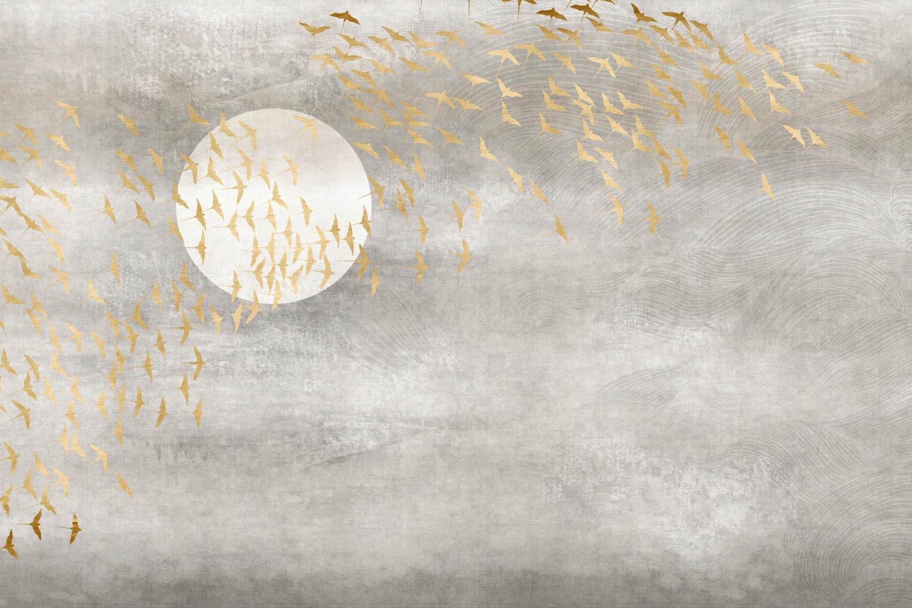 Break away from the traditional style of home décor with this mesmerizing glittery Golden Birds wallpaper mural. Birds are among the most stunning animals on the planet. With this bird design mural, you can bring the awe-inspiring majesty of birds into your home. A flock of golden birds fly high in the sky against a backdrop of the sun, creating a silhouette to glaze over. The grey background contrasts with the golden birds, adding depth to your space. This mural would be ideal for a living room, office, or bedroom. Now is the time to place your order for your favorite mural from us!