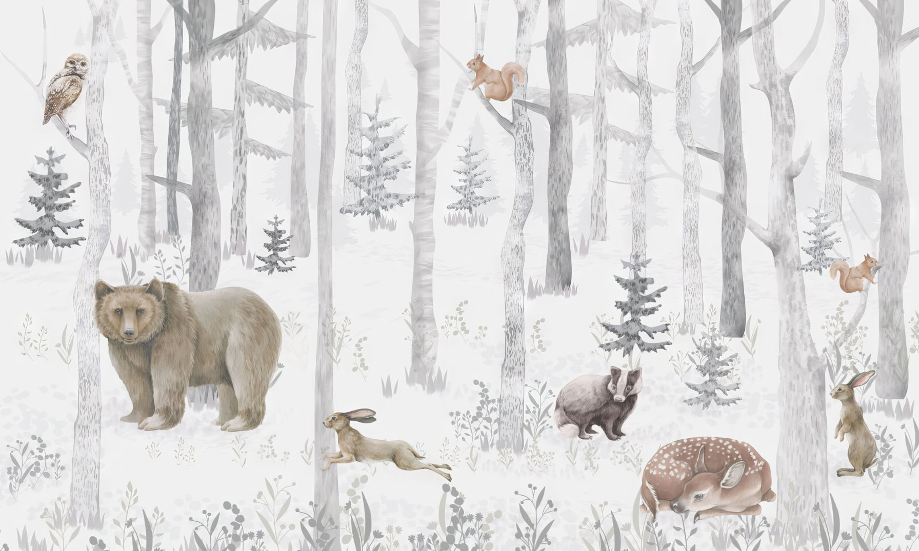 The enchanted forest animals wallpaper mural creates a different ambiance for any child's room with its serene snowy forest. Beautifully illustrated animals such as a bear, hare, squirrel, and many more add a touch of nature to your walls. The muted tones of white and gray make this mural suitable for most decor styles, merging perfectly with varied room themes. A forest wallpaper mural that would evoke a child's imagination and make him understand the wild by surrounding him with nature. Order now and give your walls a breath of the wild.