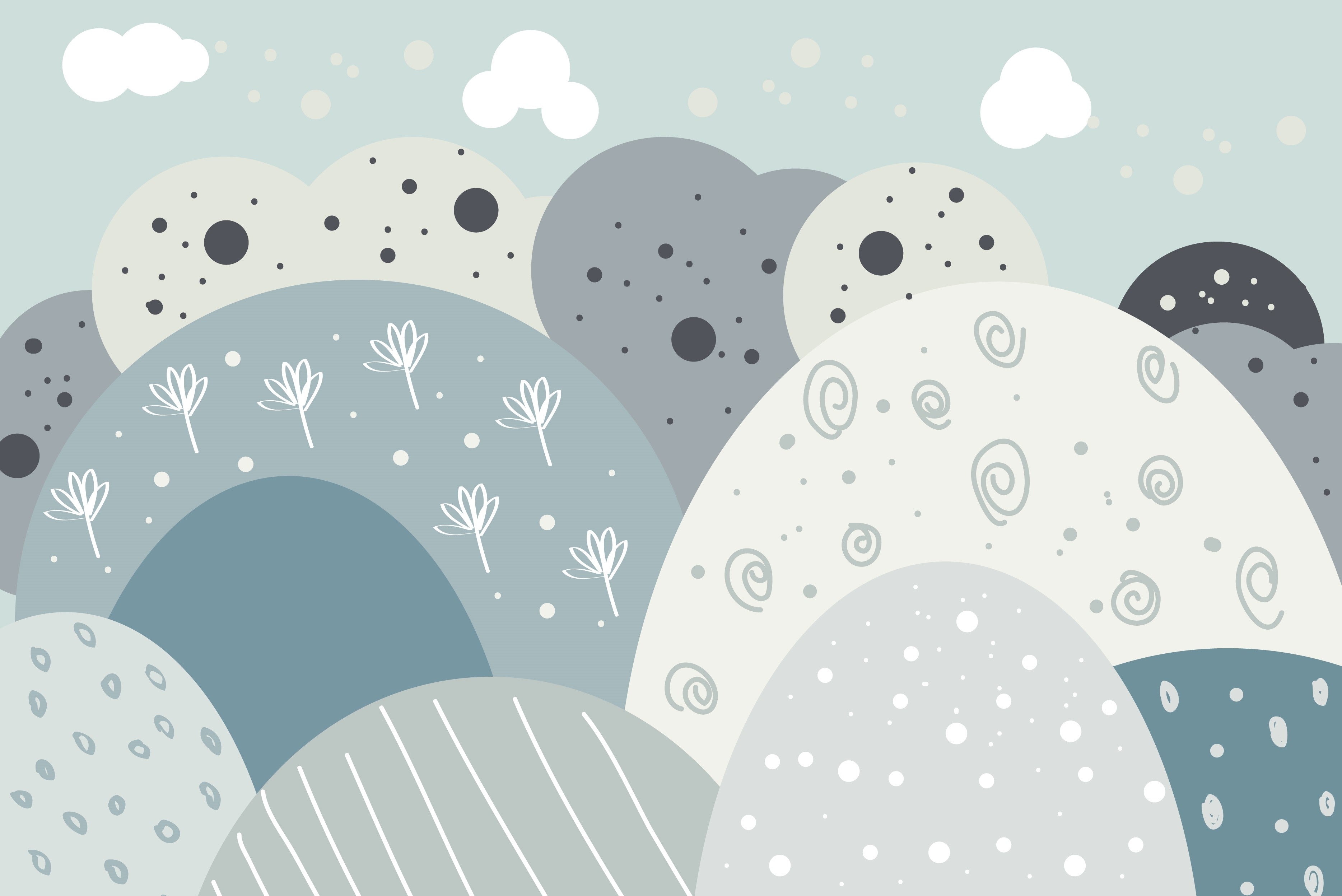 This delightful children's room wall decor features a serene pattern of whimsical hills, capturing the playful essence of a fantastical landscape. Gentle shades of grey and soft blue combine to create a calming visual experience, while charming details such as speckles, leaves, and whimsical swirls add a touch of magic. Perfect for inspiring imagination and creativity, this wallpaper mural transforms a child's space into a tranquil, storybook realm. Its easy-to-apply nature makes it a practical choice for busy parents looking to add a splash of enchantment to their little one's daily environment.