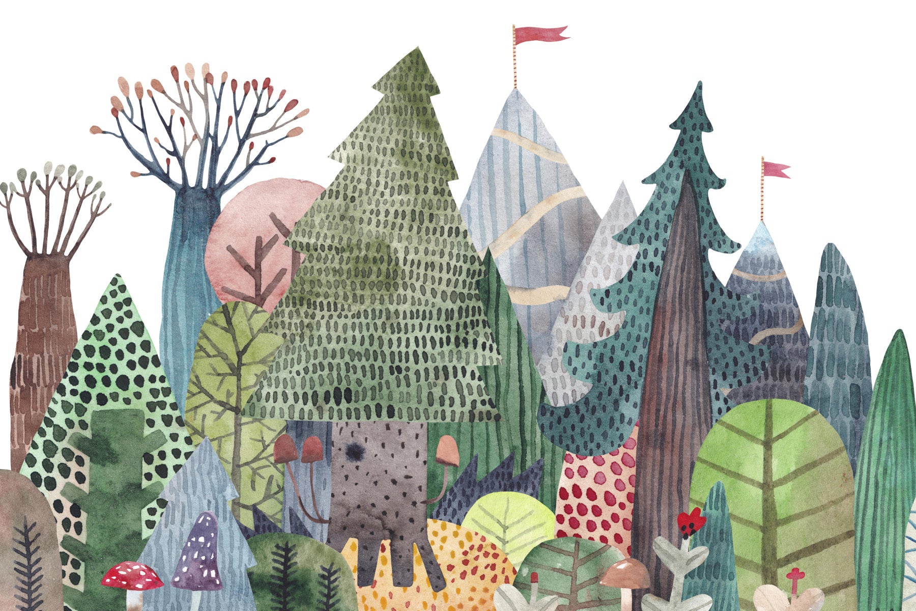 Step into a whimsical world with this enchanting watercolor scene. This wallpaper for walls features a playful forest with quirky trees and magical mushrooms, perfect for a kid's room or nursery. The soft color palette of greens, blues, and browns creates a calming atmosphere, while the hand-drawn style adds a touch of artistry. Let this design spark imagination and transform any space into a storybook setting, bringing a delightful charm to your interiors.