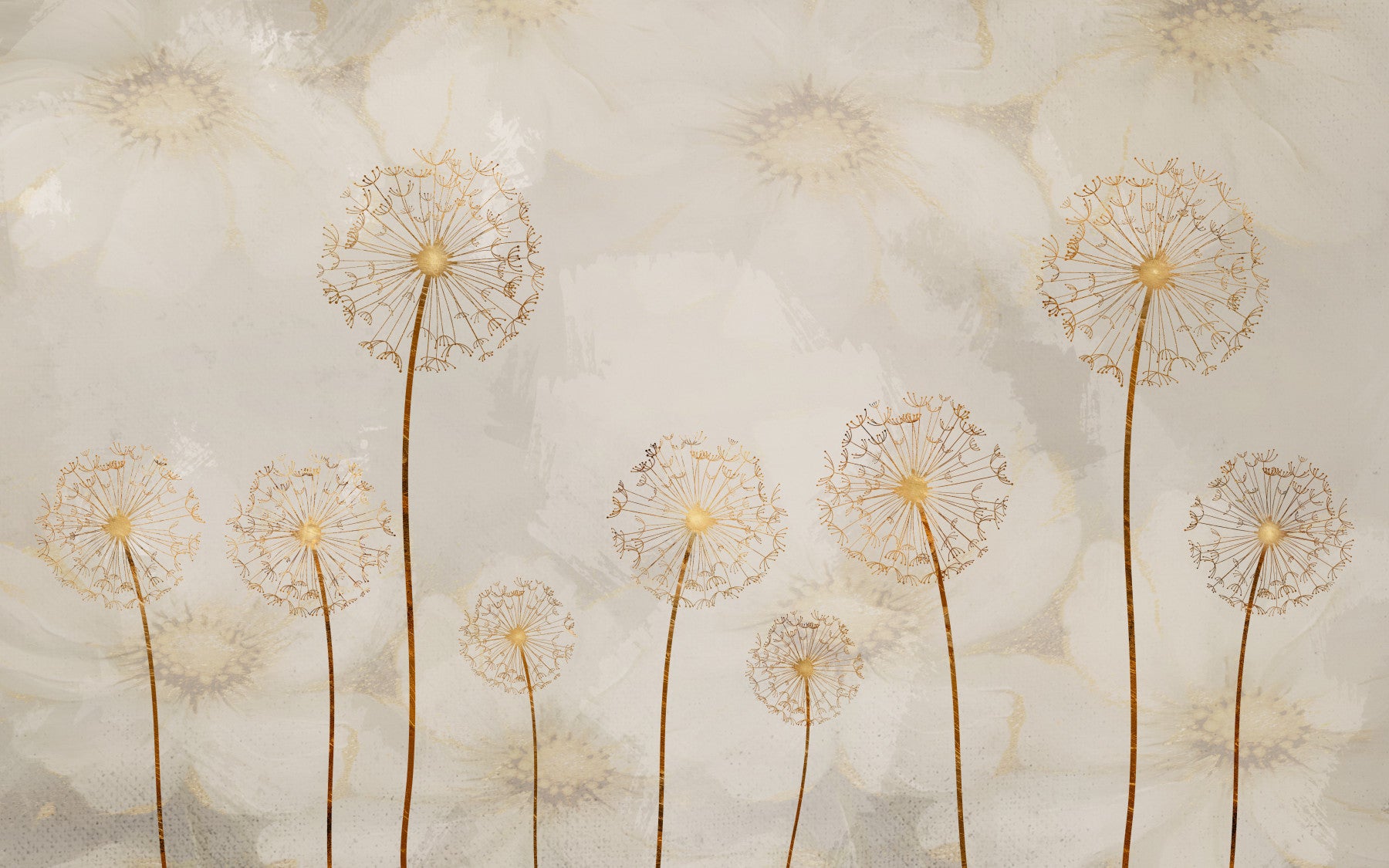 Float away with this airy dandelion wallpaper, a study in subtle grandeur. Delicate gold seed heads stand tall, offset by a light and diffused floral ground. Its calm aesthetic works wonders in creating a serene bedroom. The neutral tones blend seamlessly, making this wallpaper for walls the perfect companion for a hallway, study, or reading room. Embrace this pattern for an atmosphere of refined quietude.