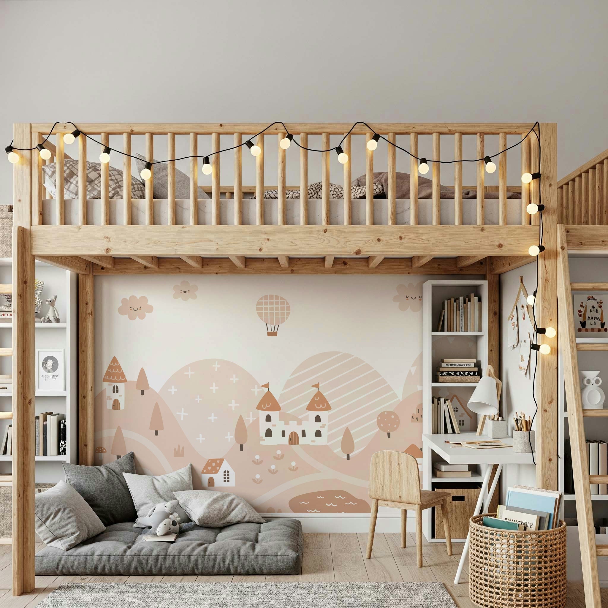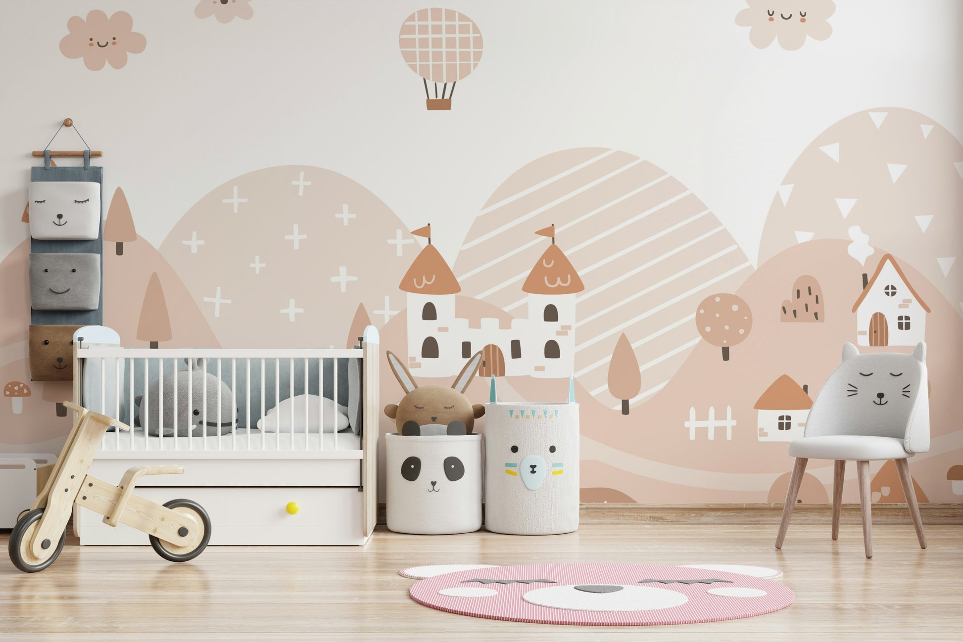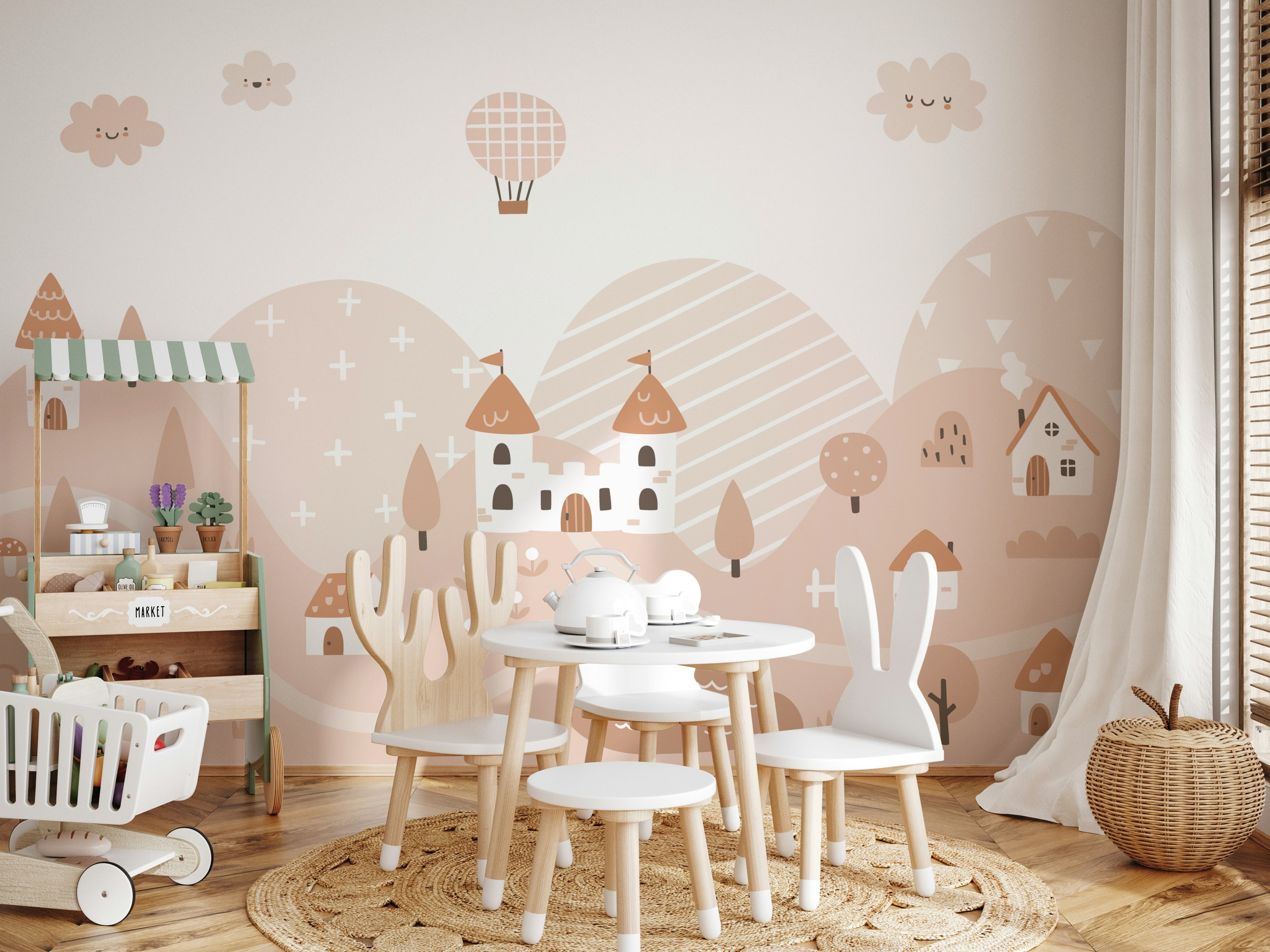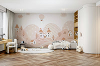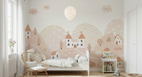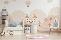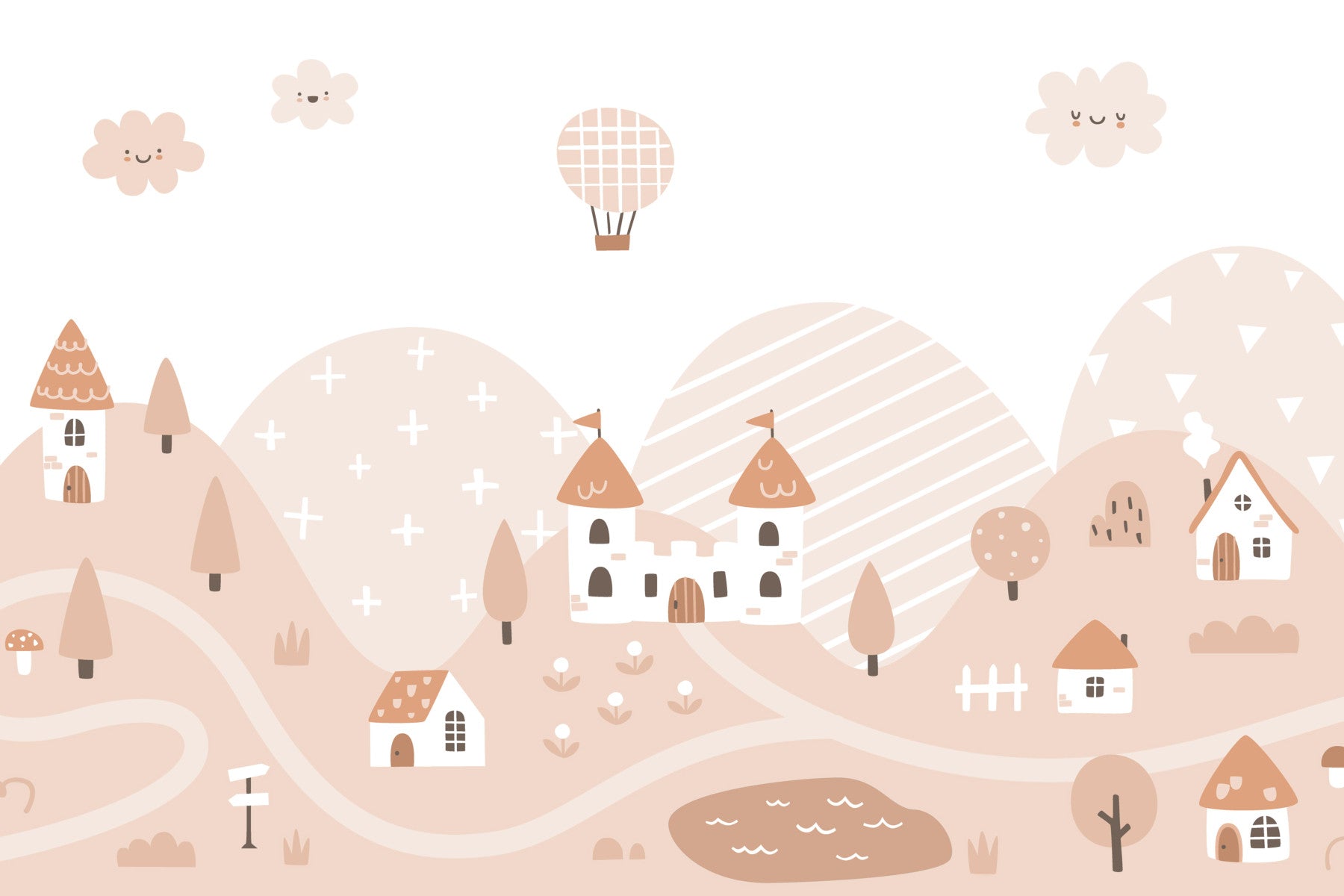 Enter a whimsical world with this delightful wallpaper for walls. A gentle, pastel color palette sets a calm tone, creating a dreamy atmosphere. Cartoon houses nestle among rolling hills, with a fairytale castle, friendly clouds, and a hot air balloon adding to the charm. Perfect for a kids room or nursery, this design fosters imagination and brings a touch of magic to any space. The neutral shades and simple graphics easily complement various interior styles.