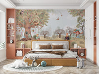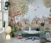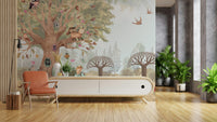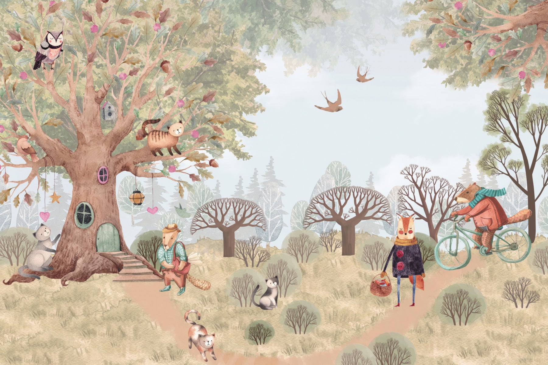 Step into a whimsical woodland dream with our 'Fairytale Forest' wallpaper. This enchanting design features a charming scene of anthropomorphic animals nestled within a serene, watercolor-style forest. A grand, ancient tree stands as the centerpiece, complete with cozy hobbit-style windows and a birdhouse, inviting you to imagine the magical creatures residing within. Friendly cats lounge in its branches, while an owl keeps a watchful eye from above. A winding path leads through the forest, where a dapper beaver strolls with his papers, and a fox carries a basket, greeted by a fellow feline. Further afield, a beaver cycles past, wearing a scarf. With a soft pastel palette and intricate details, this wallpaper adds a touch of childlike wonder and tranquility to any room, transforming your space into a storybook come to life. Perfect for nurseries, bedrooms, or any space needing a dose of fairytale charm.