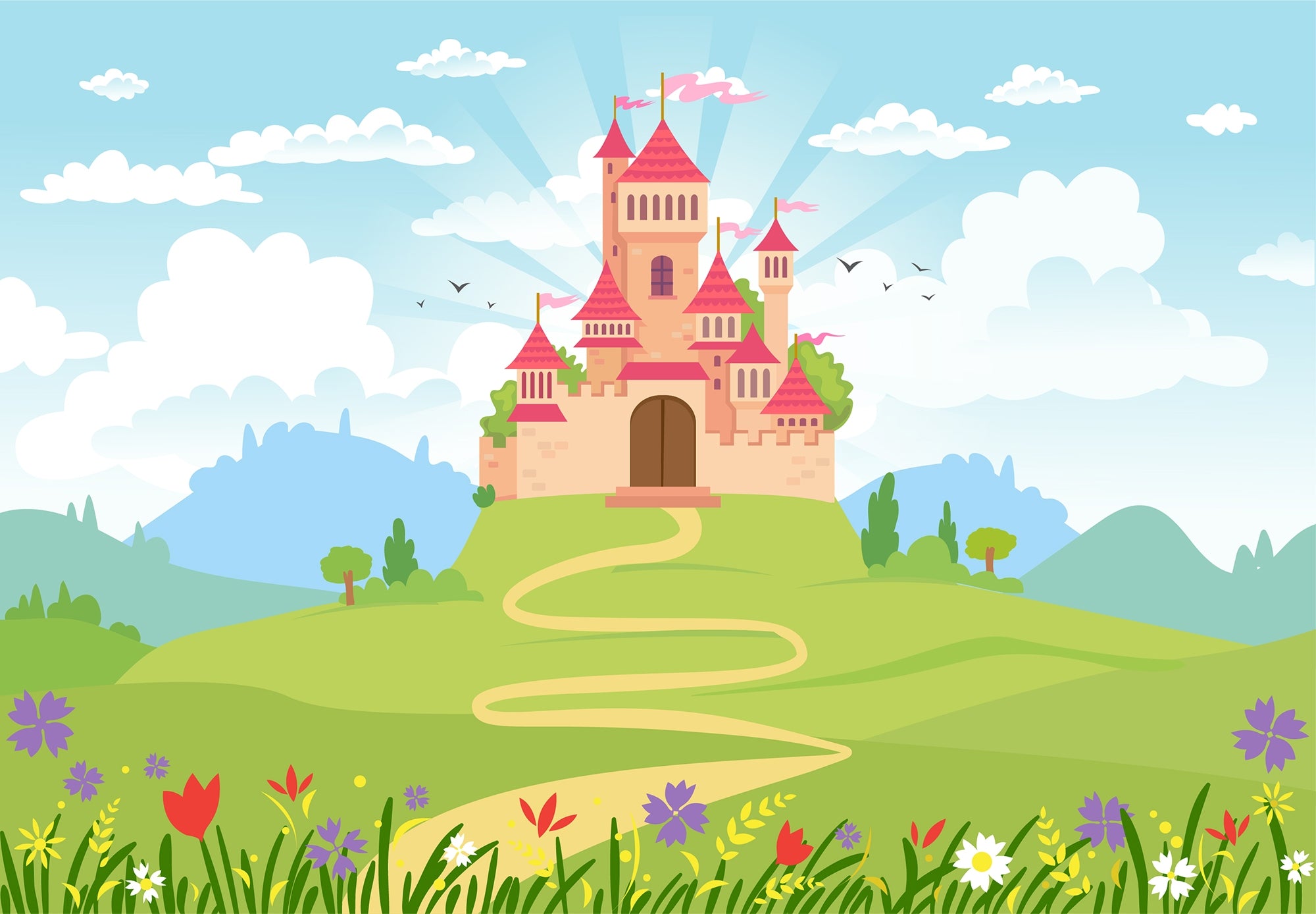 Enter a fairytale kingdom with the Fairytale Princess Castle Wallpaper Mural. This fantasy design comes with a dreamy castle placed in a beautiful landscape of soft clouds, bright flowers, and a brightened sky. It's great for a whimsical and elegant atmosphere, so this mural would be a great choice for children's bedrooms, playrooms, or spaces celebrating fantasy and imagination.