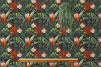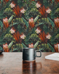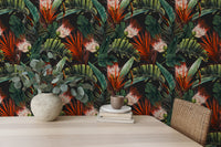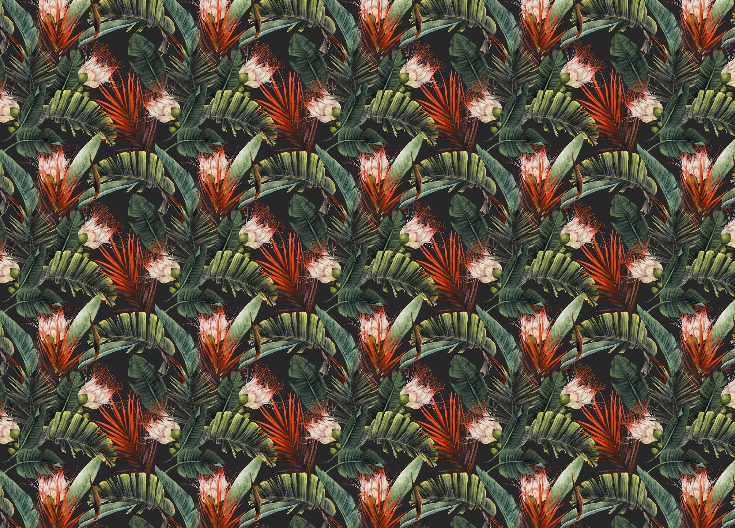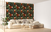 Discover a slice of paradise with our floral pattern tropical leaves dark background wallpaper. This design brings the vitality of a tropical haven right to your walls, offering a rich tableau of flourishing foliage. Crafted for those who appreciate the vibrant pulse of nature, this tropical wallpaper is a feast for the eyes, creating a dynamic yet harmonious visual experience. Perfect for adding a touch of nature's exuberance to any room, our wallpaper captures the lushness of the tropics in an elegant and sophisticated style.