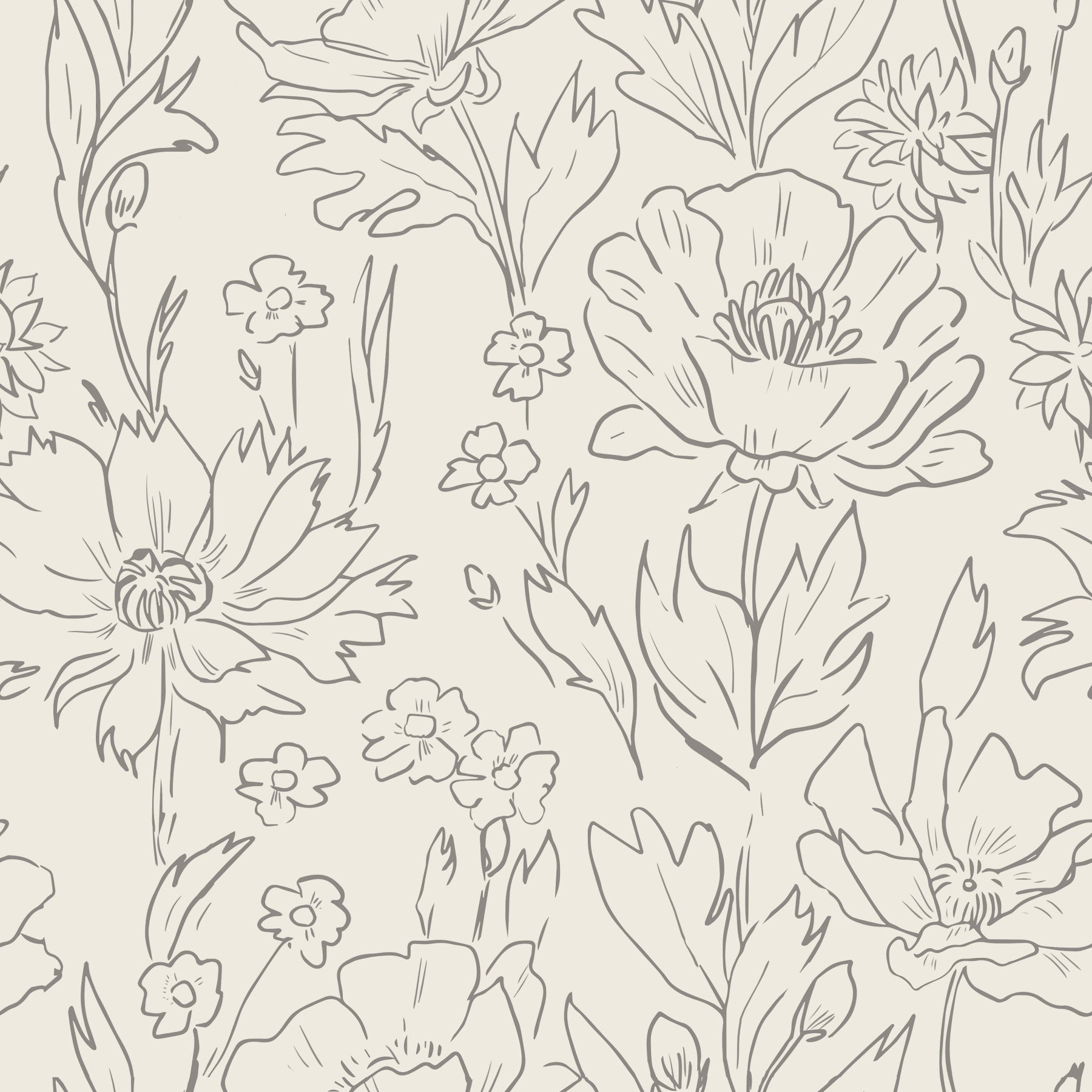 Bring a touch of understated elegance with this floral sketch pattern. The design presents delicate flower and leaf outlines in soft gray against a gentle beige backdrop. It introduces a tranquil, artistic feel to any room. This wallpaper for walls offers a calm and peaceful ambiance that blends effortlessly with various decor styles, from modern minimalist to rustic farmhouse, making it ideal for bedrooms, living rooms, or studies.