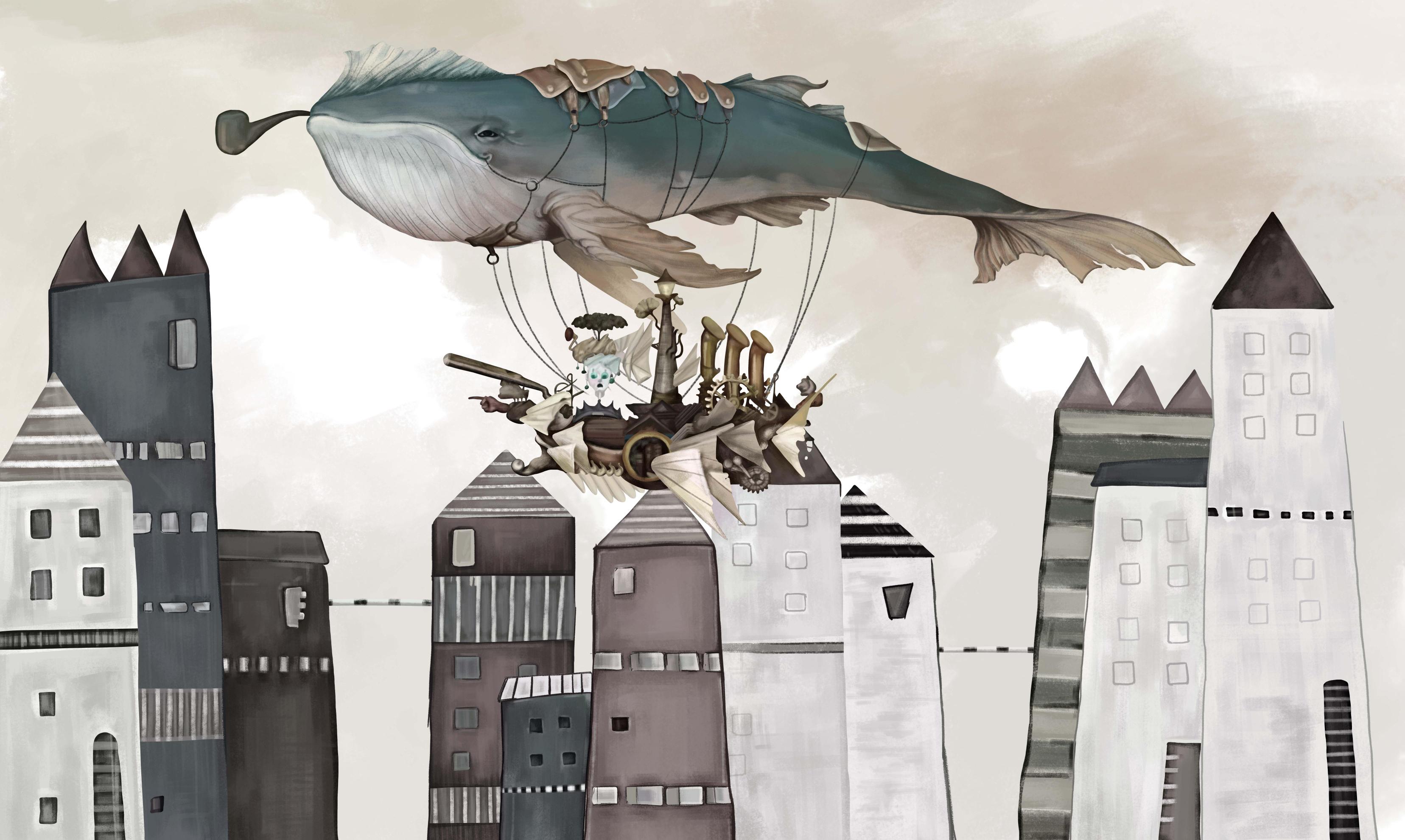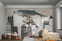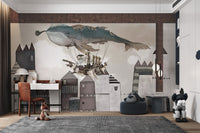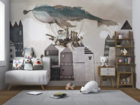 The fantastic flying whale thief vintage ship wall mural will not only give birth to an imaginative leap into the storybook adventure, but it also will make the child's bedroom wonderful. The huge gentle giant in the sea is softly tied to a pirate galleon, floating above rooftops in a dreamful manner. Each part invites curiosity - from the barnacle-covered underside of the whale, the timeworn sails, inspiring many bedtime stories. The beautiful muted color palette is highly adaptable to complement any number of color schemes, making this a gorgeous centerpiece for wallpapers in kids' rooms. Magic and adventure are brought to play - and these young imaginations might finally set sail across the winds of the escapade as they would like to envision.