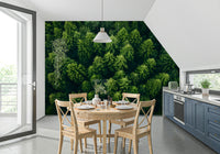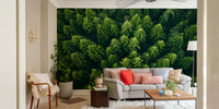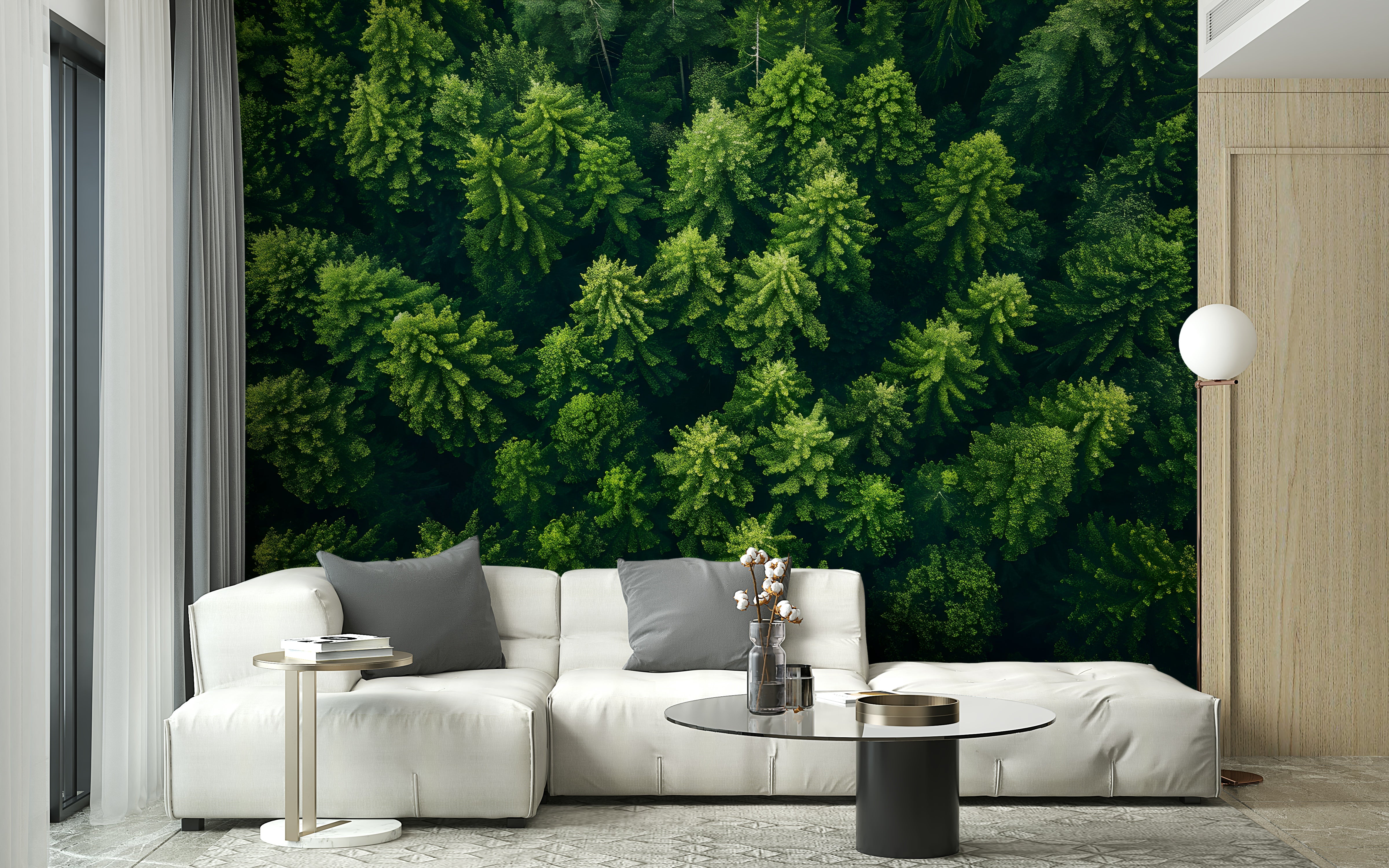 Immerse yourself in the tranquil depths of a lush forest with this captivating wallpaper. The aerial perspective showcases a dense canopy of vibrant green trees, offering a serene and refreshing atmosphere. Ideal for those seeking a nature-inspired retreat within their homes, this wallpaper for walls brings the outdoors in. Its rich, verdant tones complement living rooms, bedrooms, and even home offices, adding a touch of organic beauty to modern or rustic interiors. Transform any room into a peaceful sanctuary.