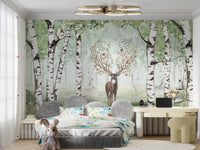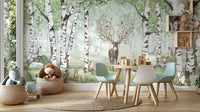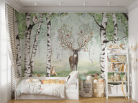 Be taken away to a magical jungle pure world. Scenic Wallpaper Is Perfect For Children's Room Murals. Admire a noble deer with head held high in the birches, with merry creatures of the forest drawing near. The forest deer wallpaper mural is perfect for setting a mystical tone, inspired by wild animals and the magic of the forest. Decorate your home with the calmness of nature that every look has a different story. The soft coloring and fine detail in the painting are a soothing and whimsical touch. Perfect for kids walls, this enchanting wallpaper mural creates a larger-than-life escape where dreams come true.