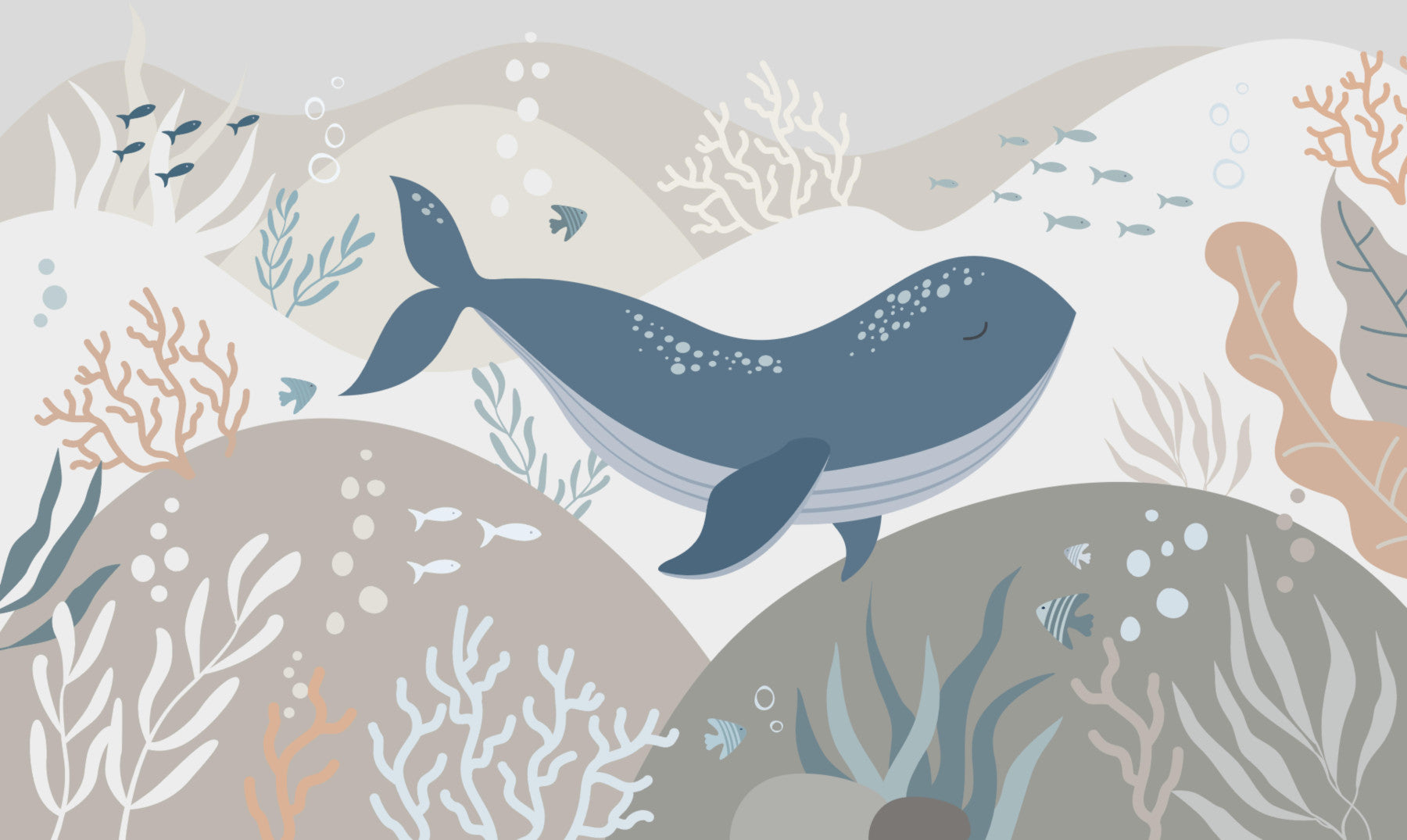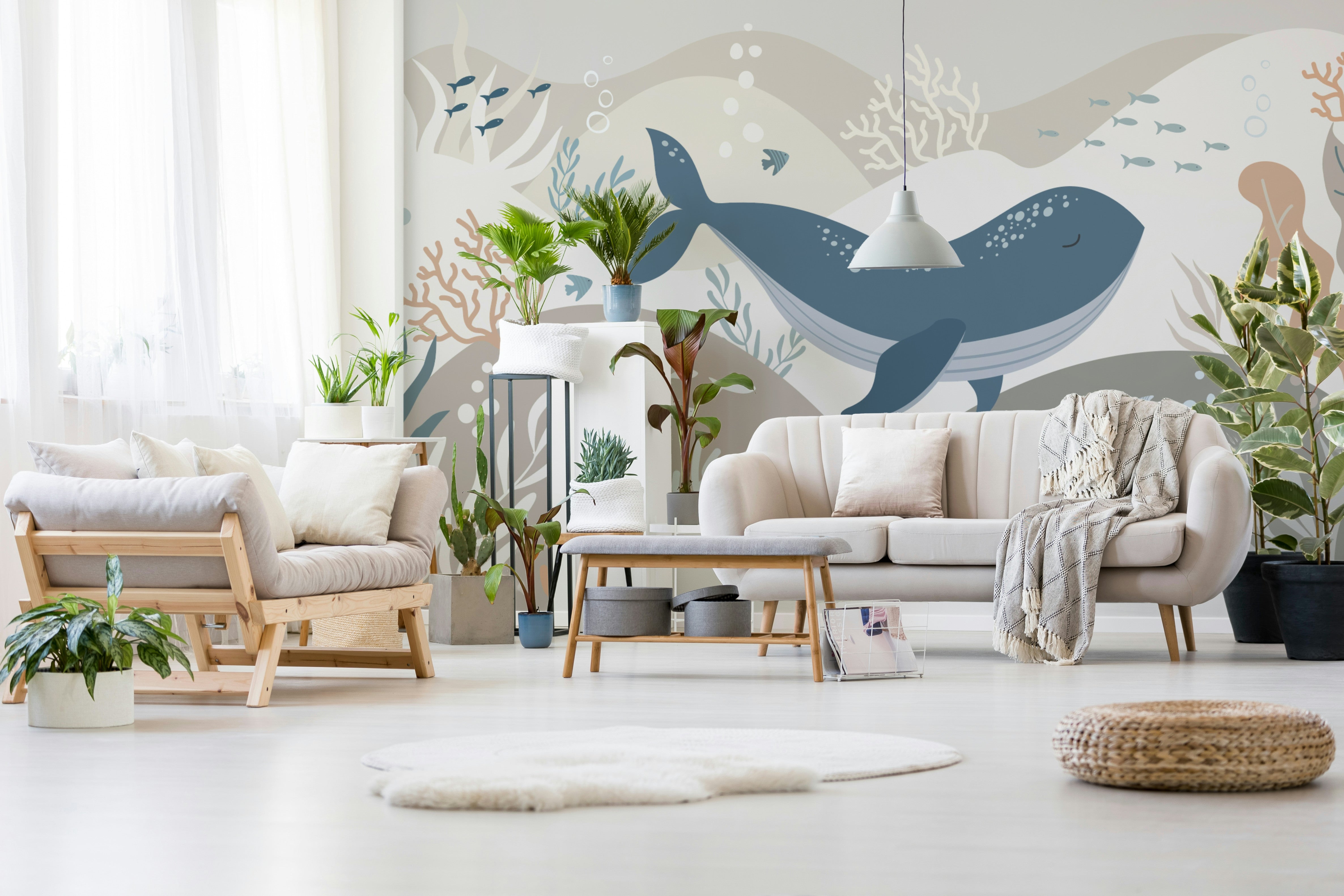 Embark on an oceanic adventure with this captivating wallpaper for walls that features a friendly whale serenely swimming through a stylized underwater world. Soft blues, gentle beiges, and hints of seafoam create a calming palette. The stylized coral reefs and playful fish offer a whimsical charm. Ideal for a nursery, children's bedroom, or playroom, this design brings the ocean's wonders indoors. It also enhances spaces with a coastal or Scandinavian design theme.