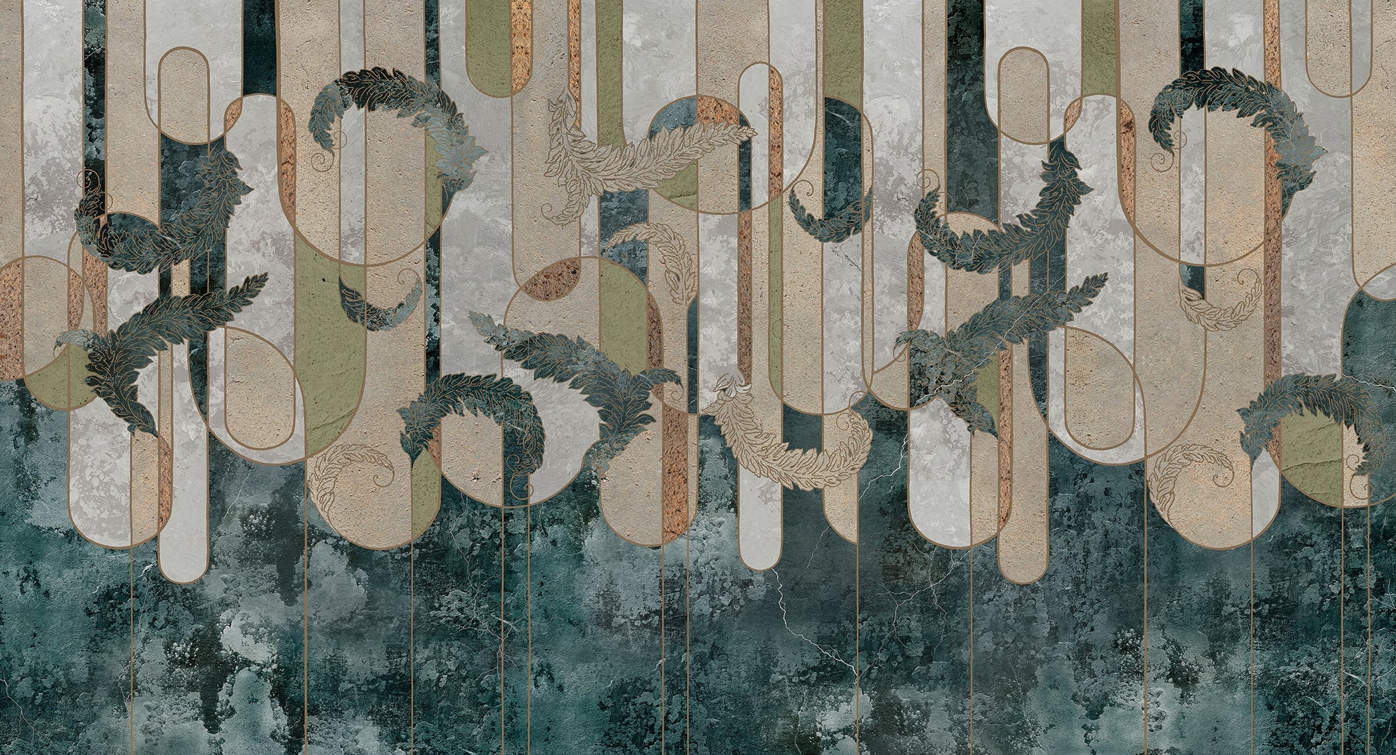 Geometric greenery mural for contemporary concrete-inspired decor.
