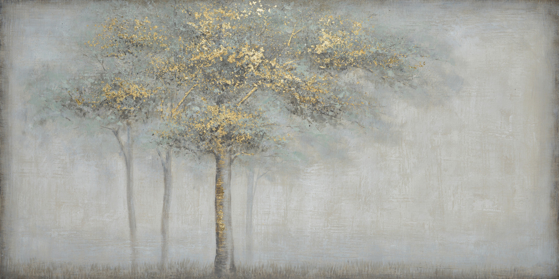 Invite tranquility into your space with this serene landscape. This wallpaper for walls showcases delicate trees with subtle grey leaves touched by gold accents. Its muted palette creates a calming mood, ideal for a bedroom, living room, or office. The soft brushstrokes and metallic highlights will add a touch of simple sophistication to your home. Enhance your interiors with this simple yet elegant design and make it a feature wall.