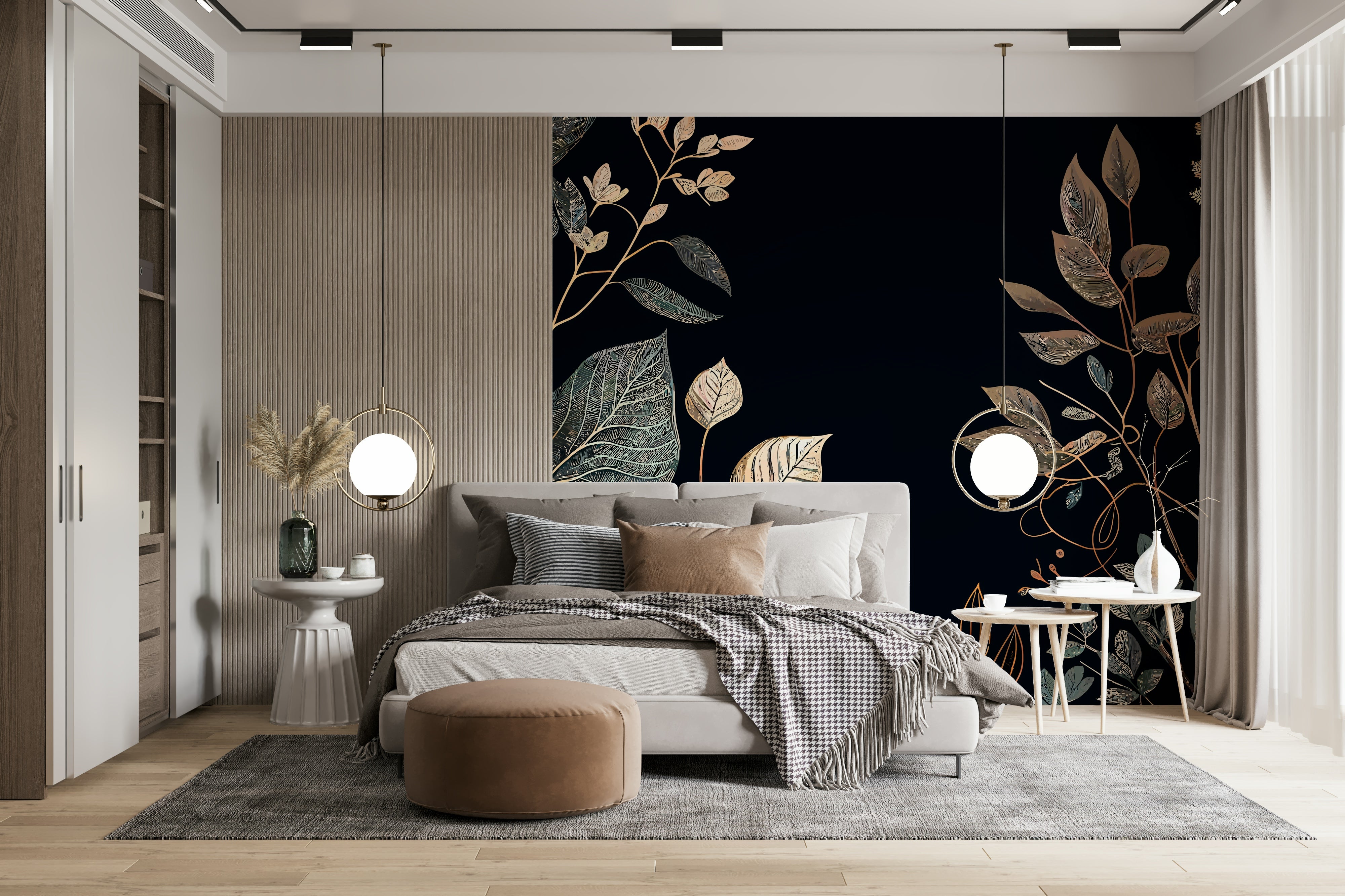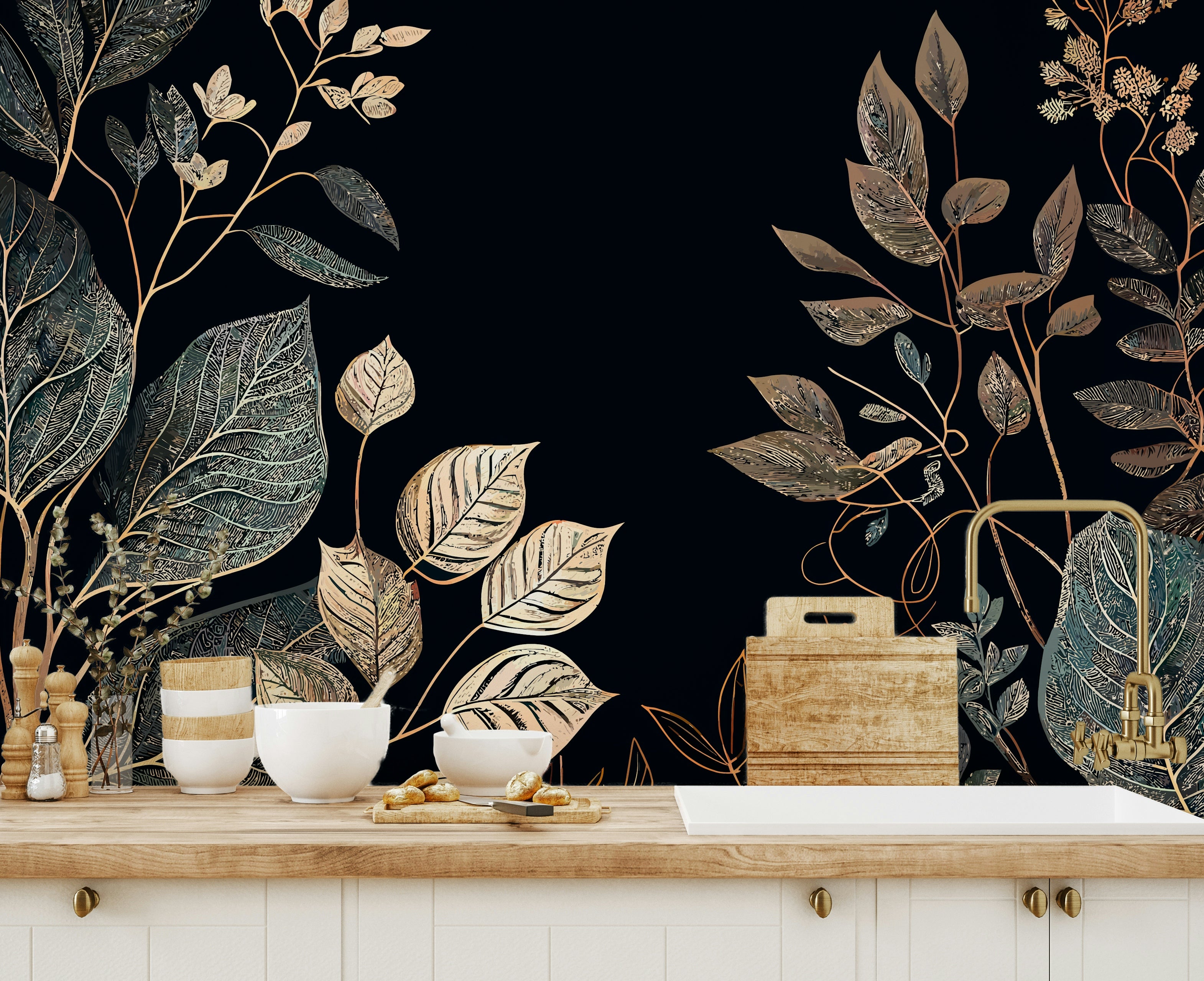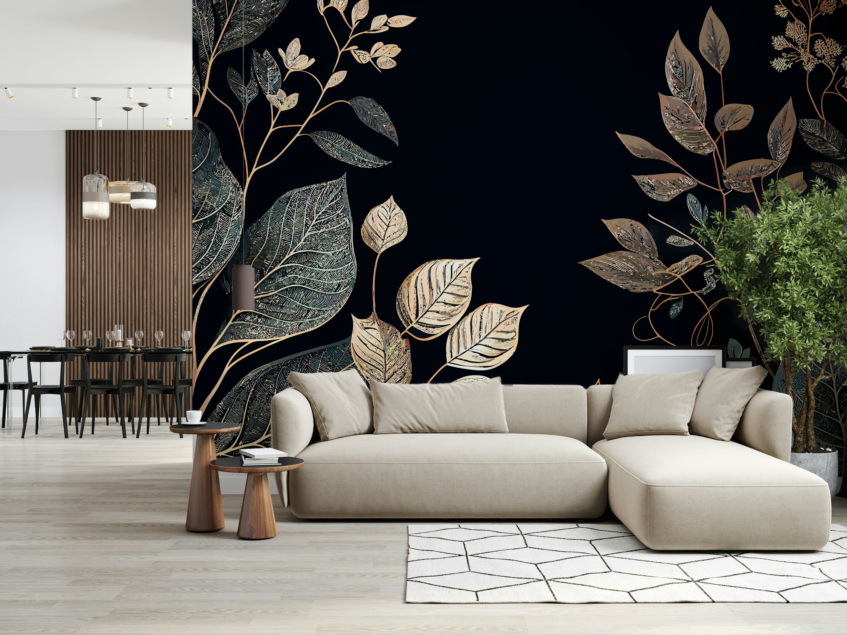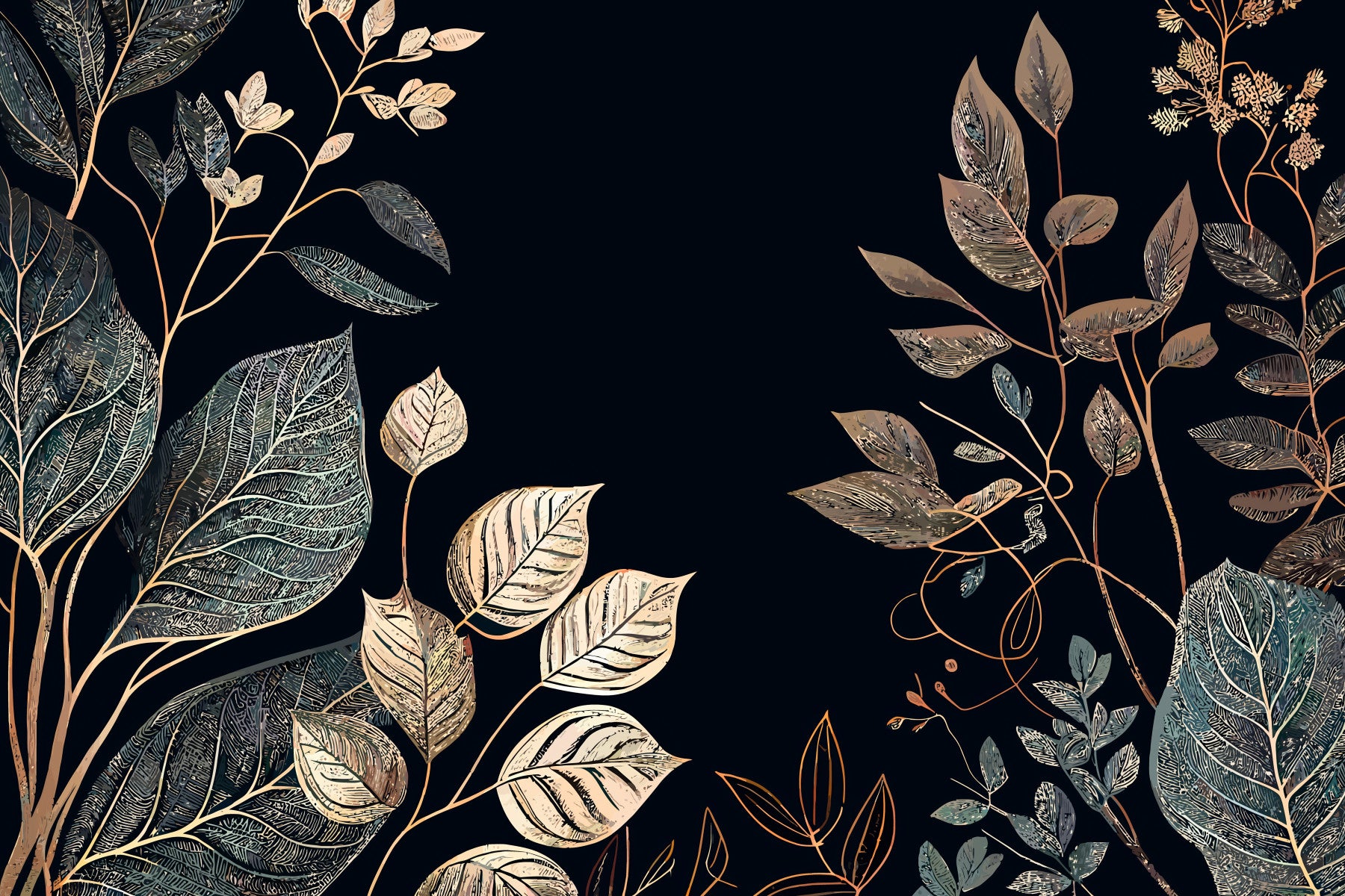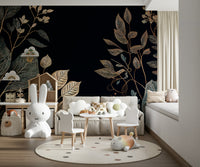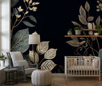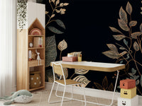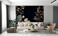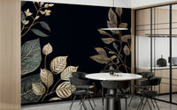 Embrace the enchanting allure of "Golden Autumn" with this exquisitely designed wallpaper. A deep, velvety black backdrop sets the stage for a mesmerizing display of meticulously detailed foliage. Elegant branches, adorned with leaves in various stages of autumnal transformation, create a rich tapestry of textures. Shimmering gold accents trace the veins of each leaf, catching the light and evoking a sense of luxurious warmth. This design captures the essence of the season's transition, balancing a mood of reflection and nature's last burst of color. Transform your screen into a sophisticated celebration of autumn's beauty with this artful and refined backdrop. Perfect for adding a touch of seasonal elegance to any space.