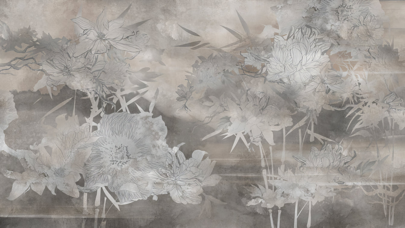 Large flower sketches on a textured gray background, creating a serene ambiance.