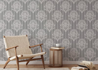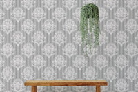 Grey and White Vintage Ornaments Damask Pattern Wallpaper