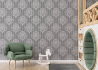 Adorn your walls with the timeless beauty of damask wallpaper, a fusion of vintage charm and modern elegance. This exquisite grey wallpaper features intricate white vintage ornaments that bring a subtle, refined look to your home or office. The classic damask design creates a sophisticated backdrop, perfect for those who appreciate historical motifs with a contemporary twist. Make a statement with this grey and white pattern, seamlessly blending with various decor styles for a stunning visual impact.